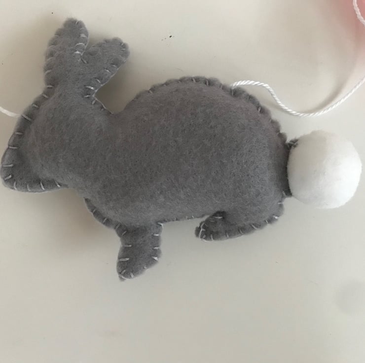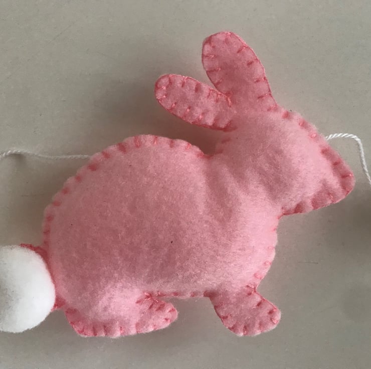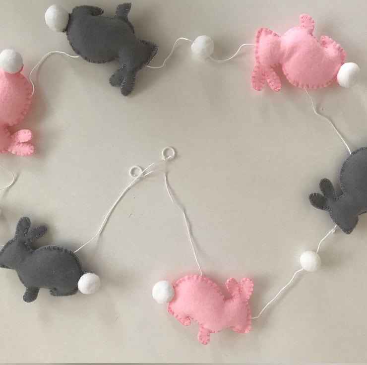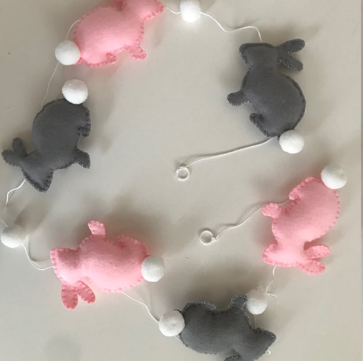 Handmade Bunny Garland decorated with pink and grey bunnies with white fluffy tails