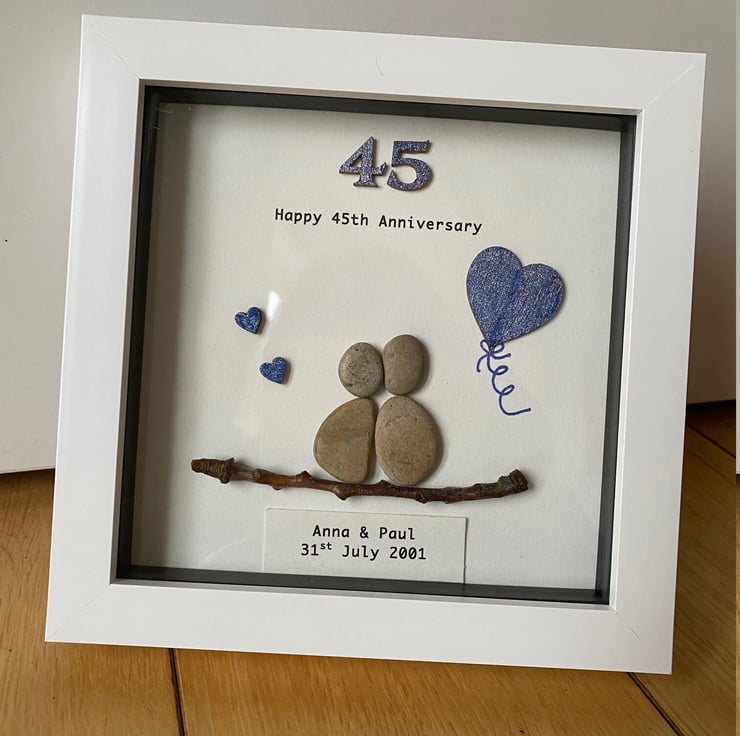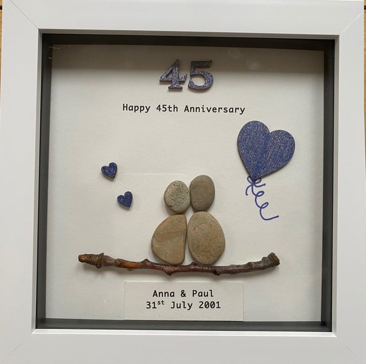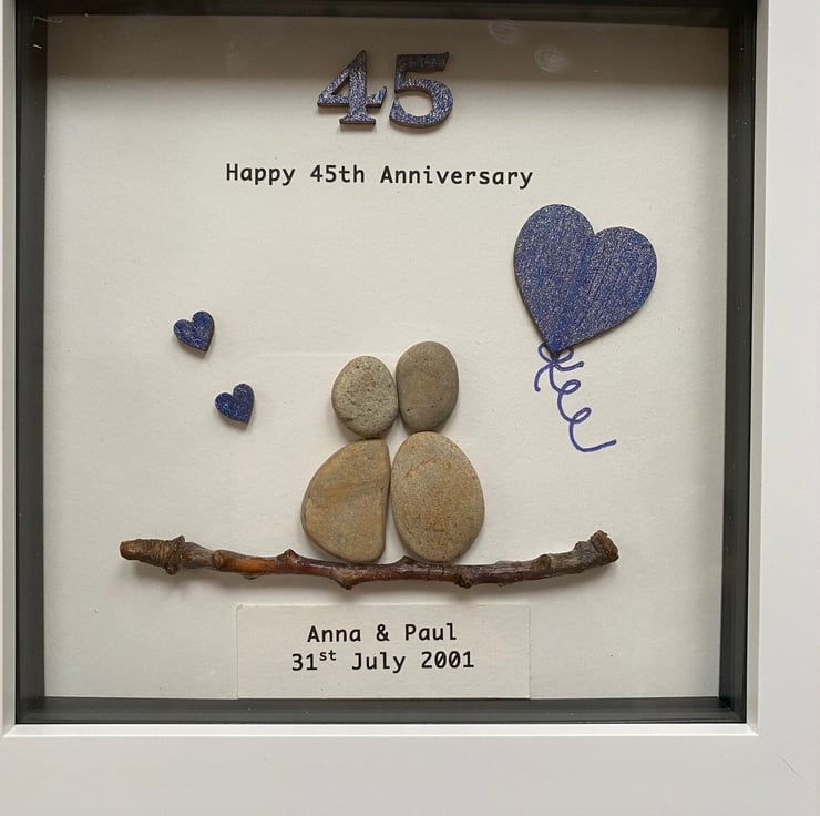Frame Measures 15cm x 15cm and is decorated with wooden twigs and hearts, pebbles, wooden numbers and sapphire effect heart