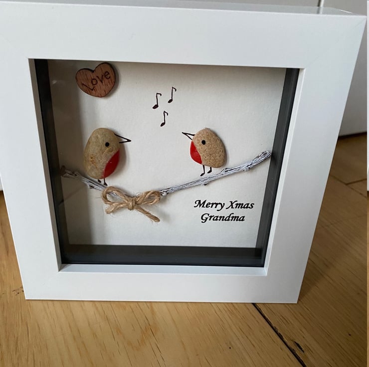 Small pebble artwork frame for Granny at Christmas time. Decorated with painted Robin pebbles, twigs and a wooden heart