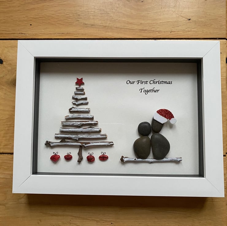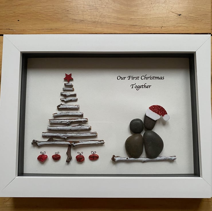 Decorated with twigs to form a tree, painted tiny pebbles as presents under the tree, pebble couple with xmas hat