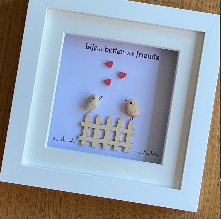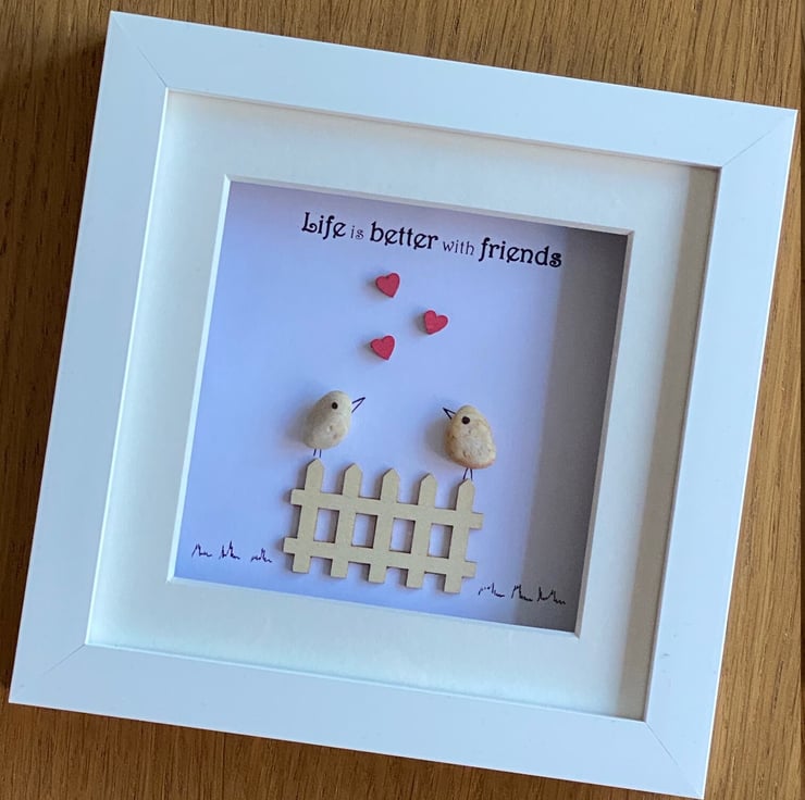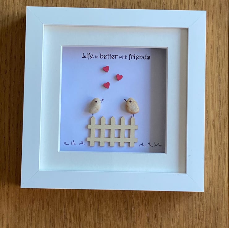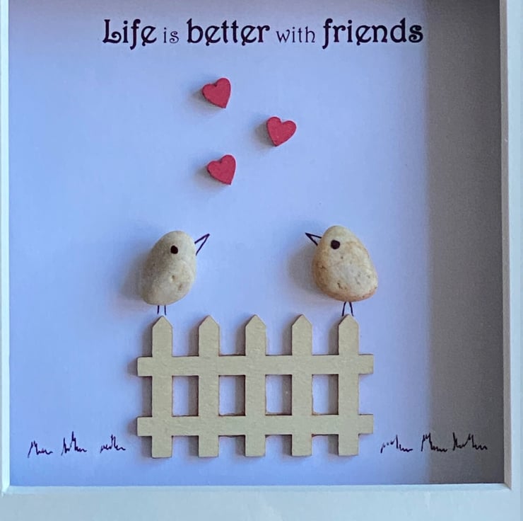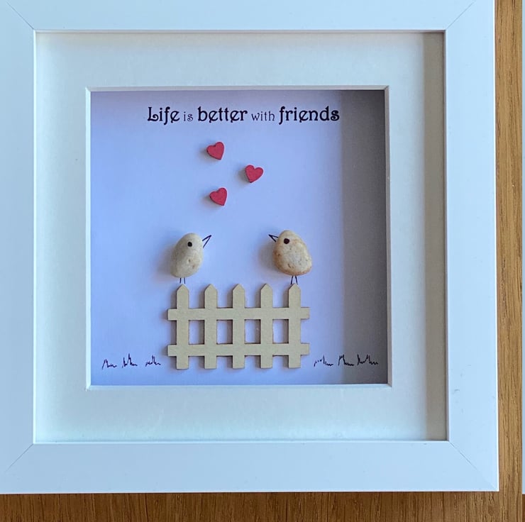 Decorated with pebbles resembling two birds on a wooden fence and tiny wooden hearts