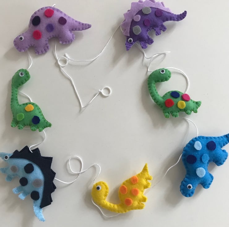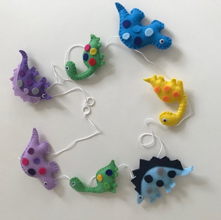This handmade felt garland with dinosaurs will add the perfect touch to your little one's baby nursery, bedroom or baby shower decorations. It also makes a great gift for a birthday or Christmas gift.