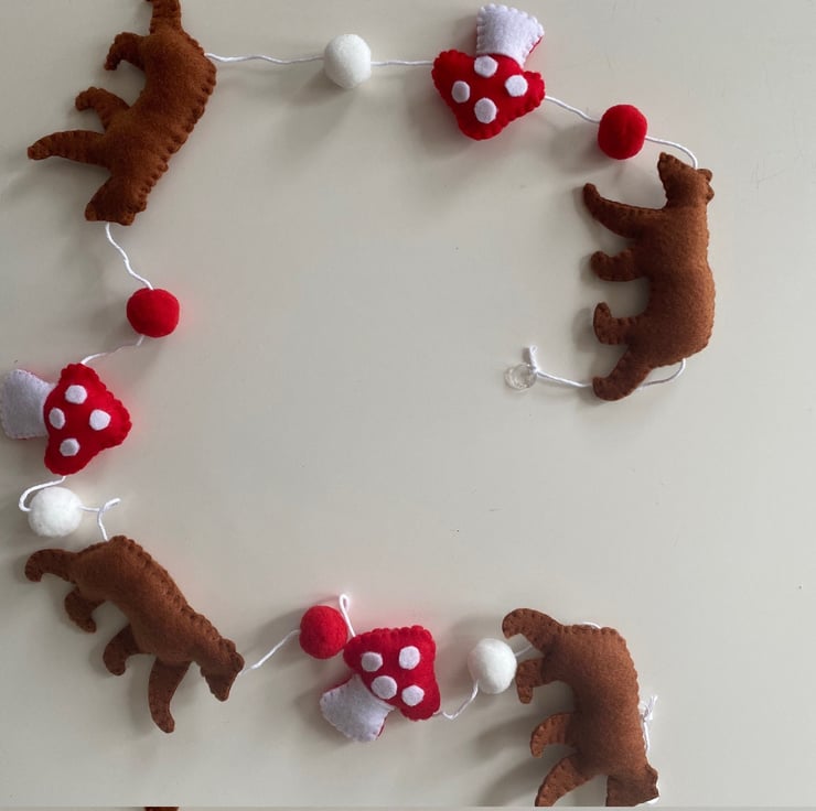 The garland measures approx 1.30cm and it contains 4 felt bears and 3 felt mushrooms. It is blanket stitched with cotton thread. They are lightly stuffed with a high loft toy filling to create cute and puffy little ornaments.