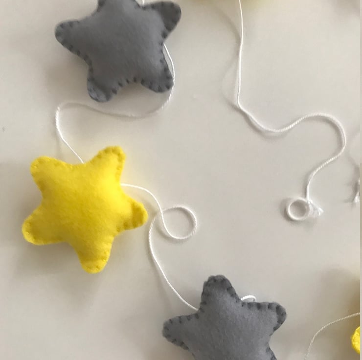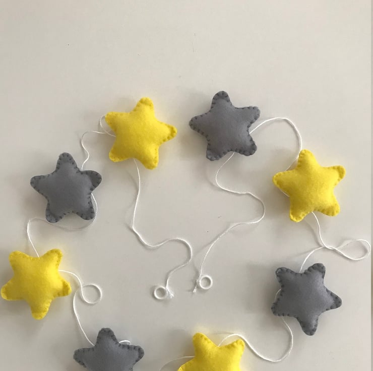 The garland measures approx 1.60cm and it contains 4 yellow stars and 4 grey stars in felt and blanket stitched with cotton thread. They are lightly stuffed with a high loft toy filling to create cute and puffy little ornaments.
