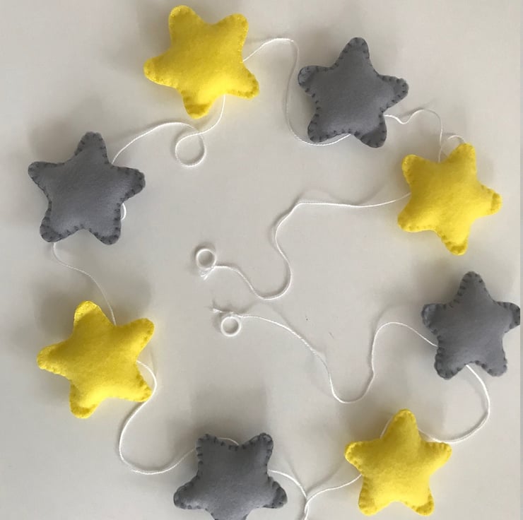 This handmade felt garland with Grey and yellow stars will add the perfect touch to your living room, kid's room or nursery or even office. It also makes a great gift for birthday or Christmas.
