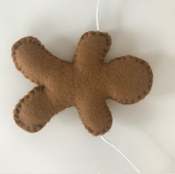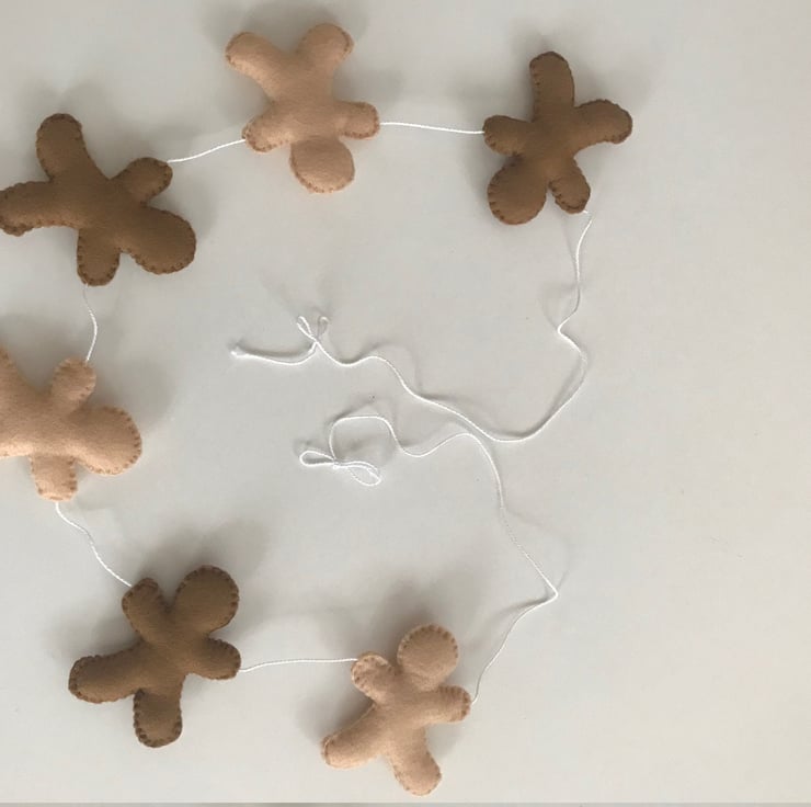 The garland measures approx 1.30cm and it contains 6 gingerbread men in felt and blanket stitched with cotton thread. They are lightly stuffed with a high loft toy filling to create cute and puffy little ornaments.