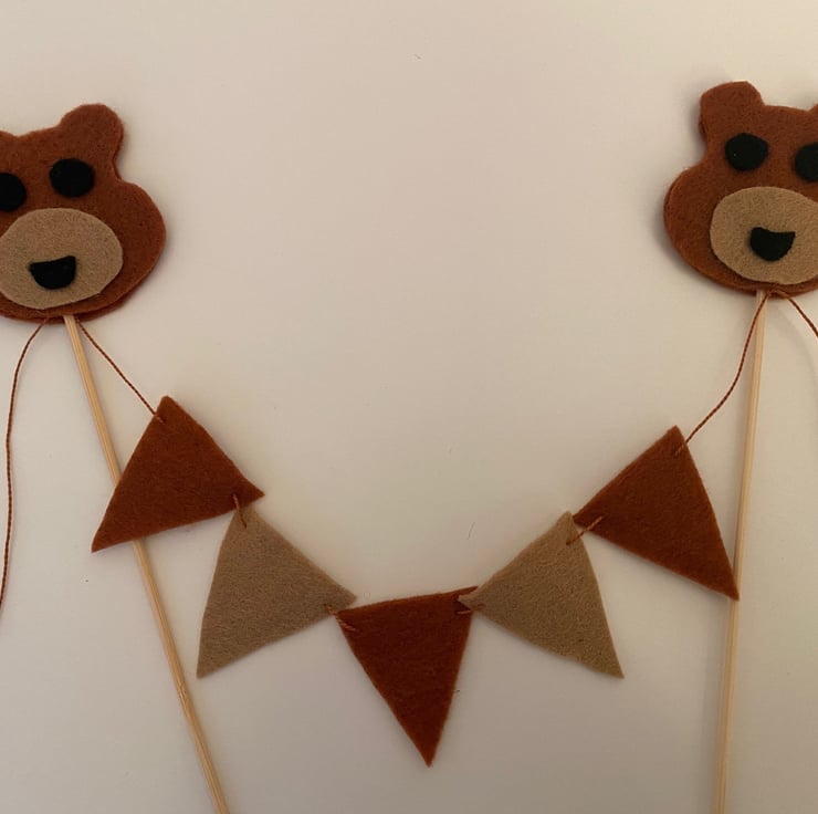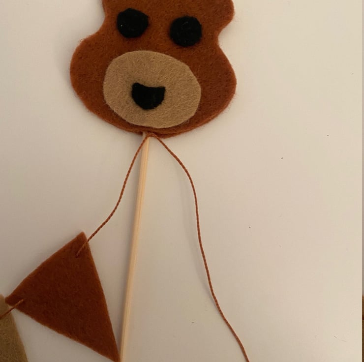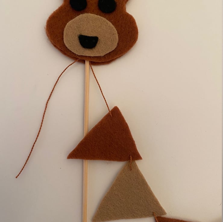 Comes with 2 Bamboo Sticks (Skewers), 5 mini felt triangles in brown and 2 felt cut dinosaurs teddy bears at the top of each stick