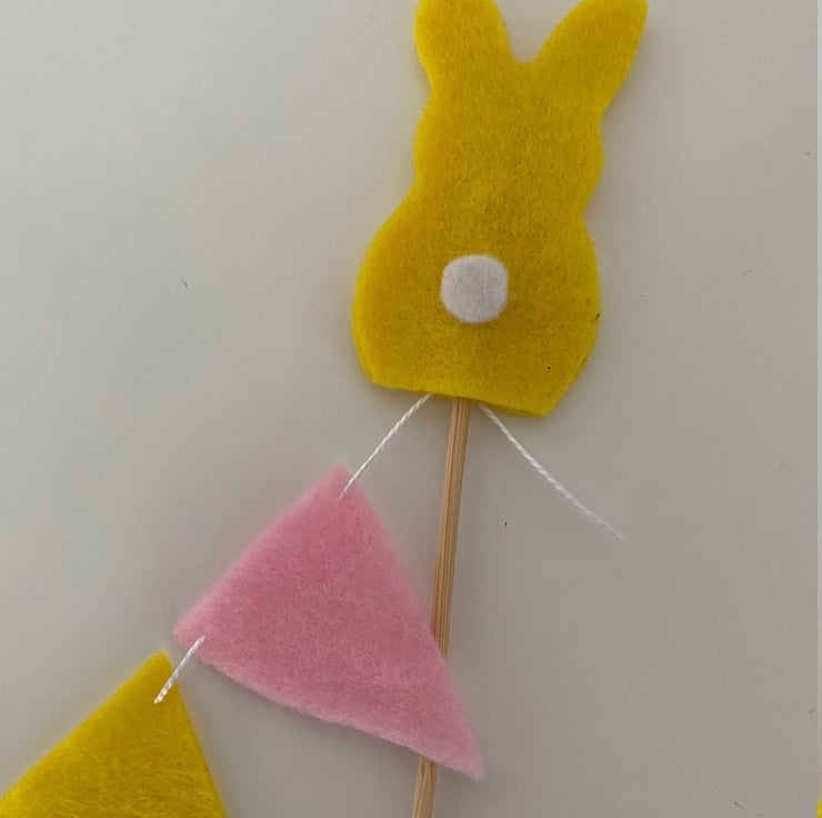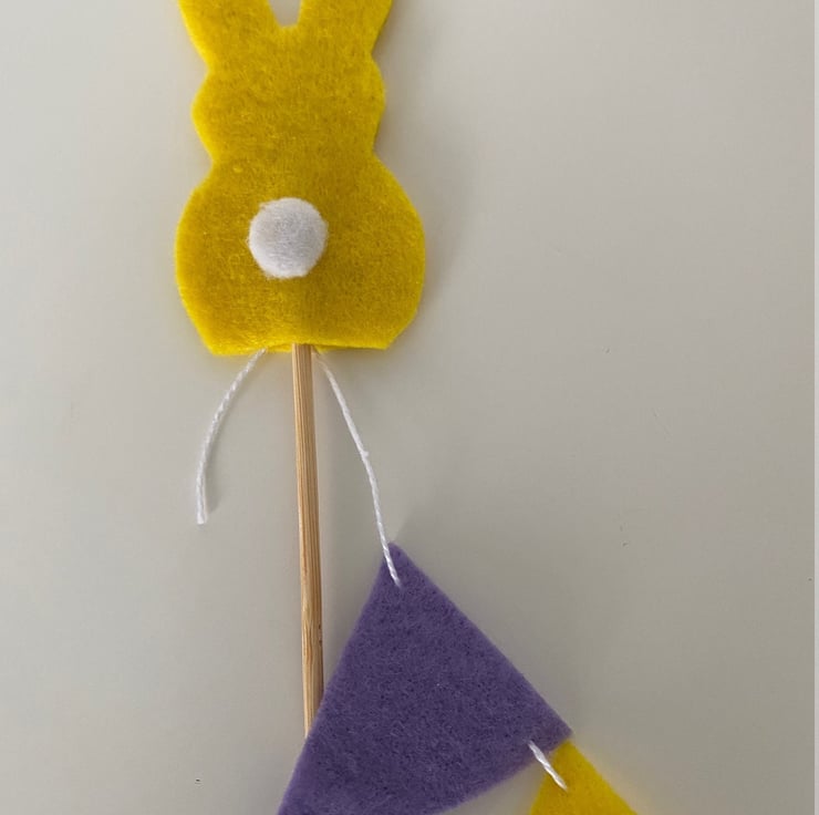 Comes with 2 Bamboo Sticks (Skewers), 6 mini felt triangles in varied colours and 2 felt cut yellow bunnies at the top of each stick.