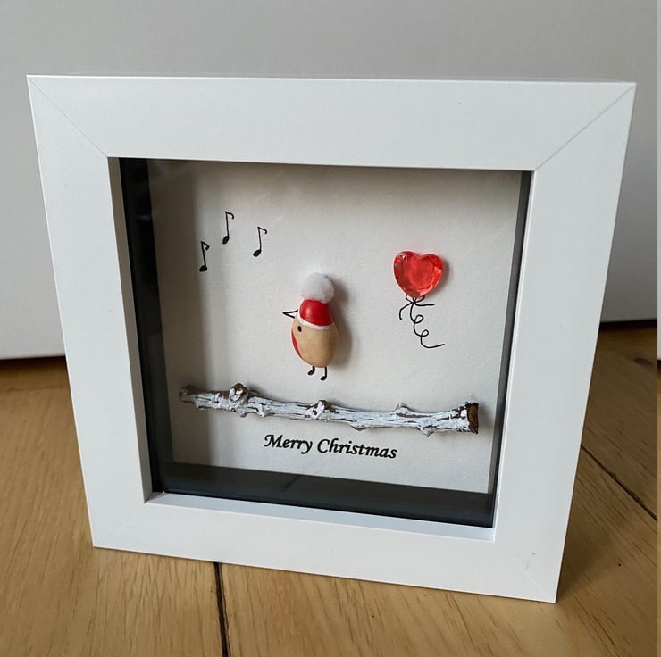 Pebble Frame with a pebble Robin and a little red heart with the message "Merry Christmas"