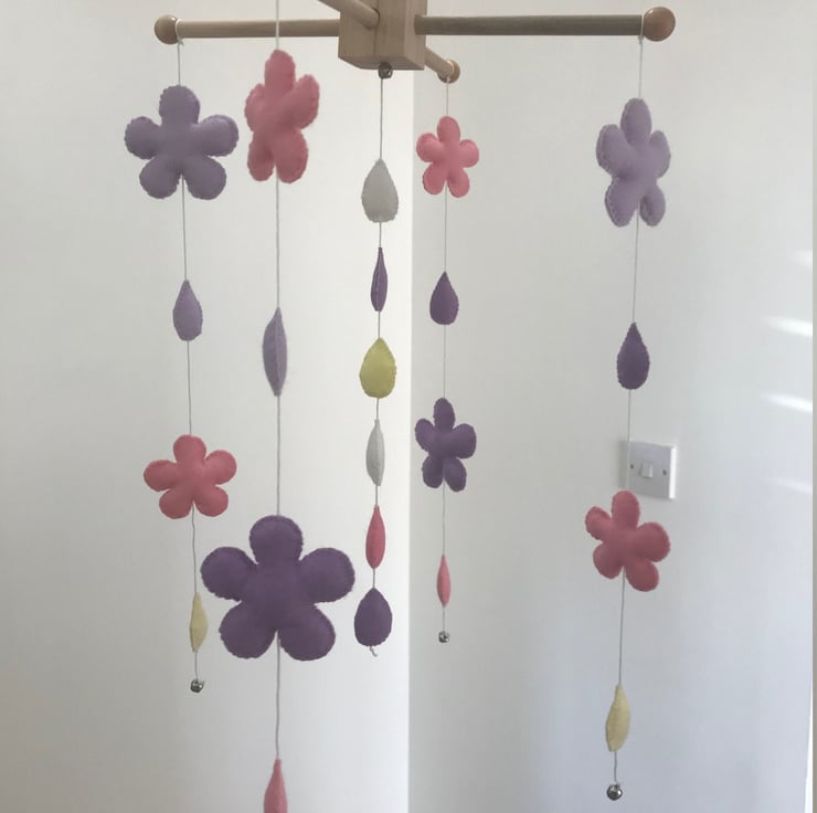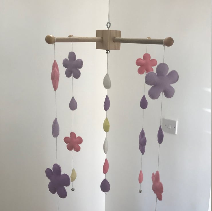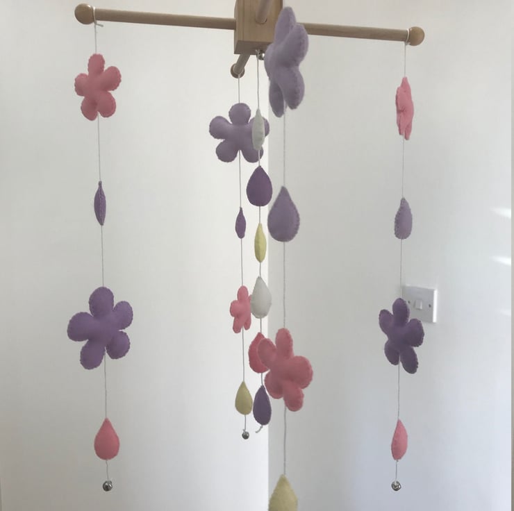 Made with Wool Felt and Natural Wood. Contains Purple and Pink Flowers and multi coloured Rain Drops. Small silver bells at the bottom of each string.