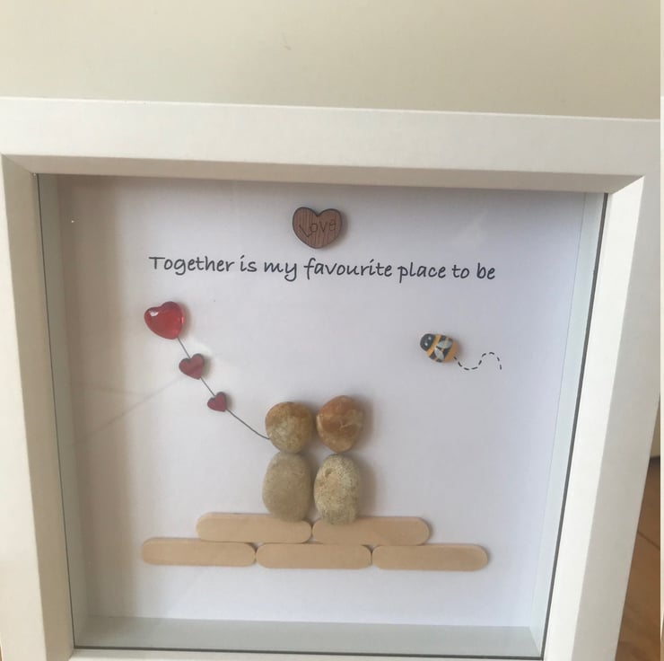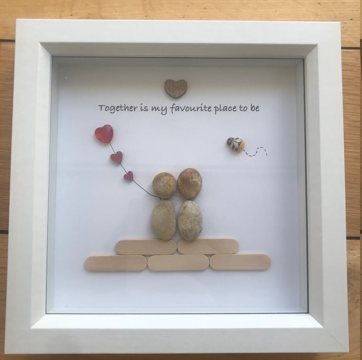 Decorated with pebbles, wooden sticks and gem hearts as well as a wooden hearts and Bee