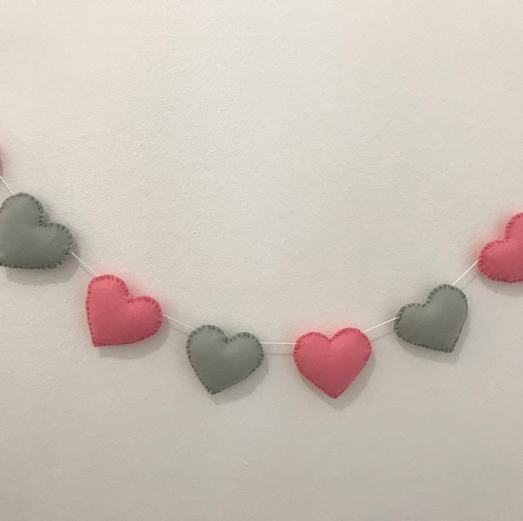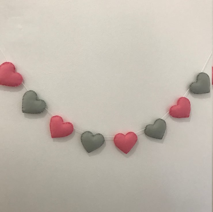 This fluffy hearts garland consists of 8 hearts (4 grey and 4 pink ) made with soft 100% wool felt and blanket stitched with cotton thread. They are lightly stuffed with a high loft toy filling to create cute and puffy little clouds.
