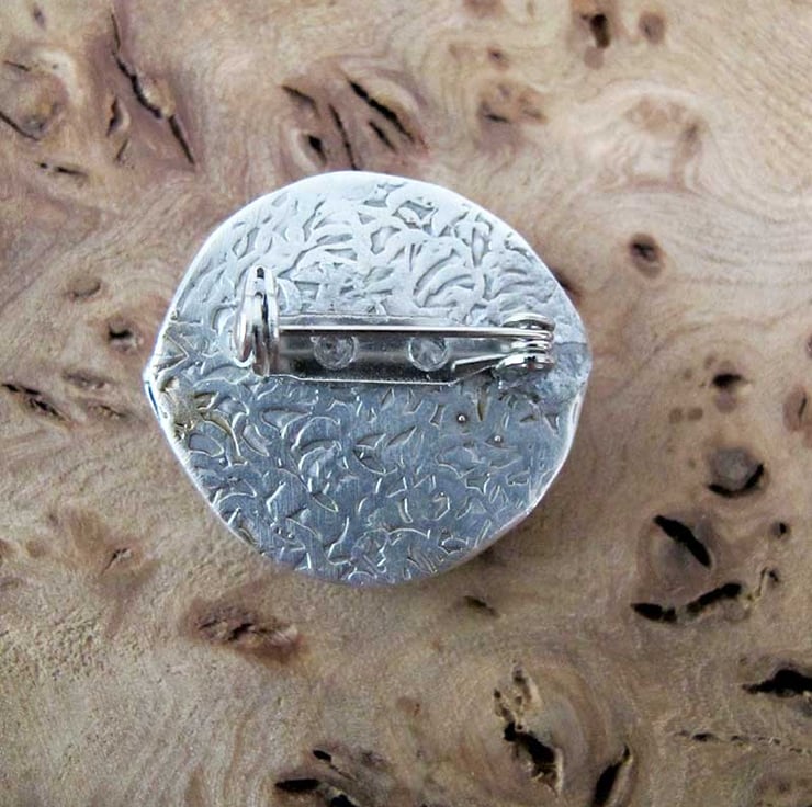 A beautiful hand crafted brooch made from a vintage china plate, in an antiqued silver metal mount. The brooch measures 3cm diameter and 0.7cm deep, not including pin.