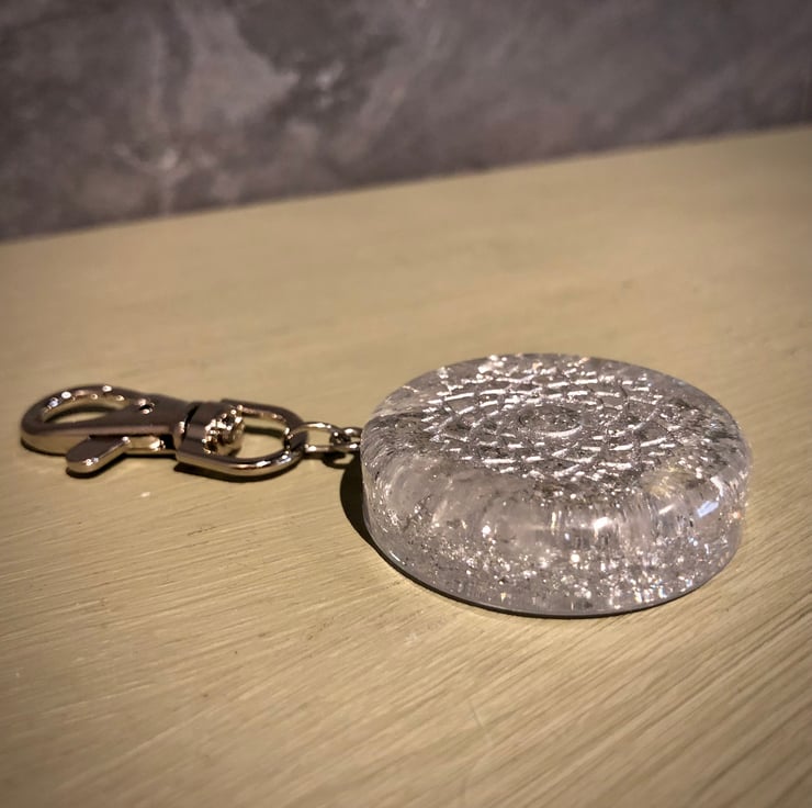 This stunning bag charm symbolises the Crown Chakra and encases one of the most powerful crystal ever discovered, Clear Quartz.