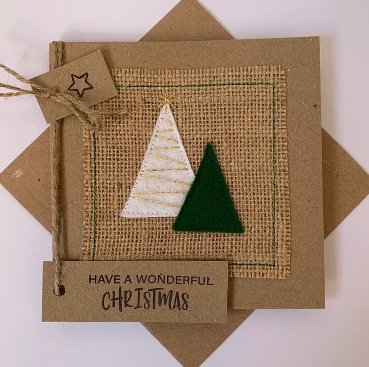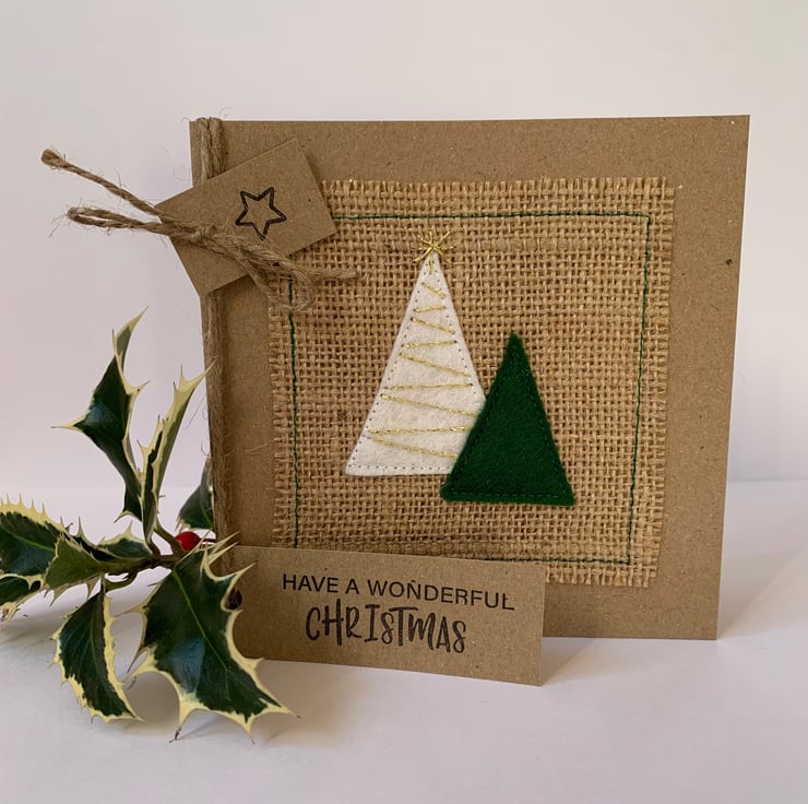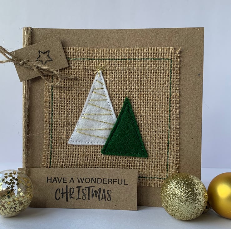 This handmade Christmas card is decorated with festive trees in green and white. The decoration is hand cut from 100% wool felt and machine stitched to hessian, added sparkle is hand sewn using a gold metallic thread.