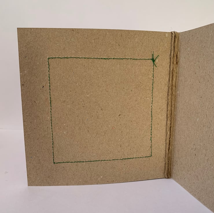 The hessian is machine stitched, using a contrasting thread, onto a plain brown recycled card. This stitching is visible on the inside of the card.