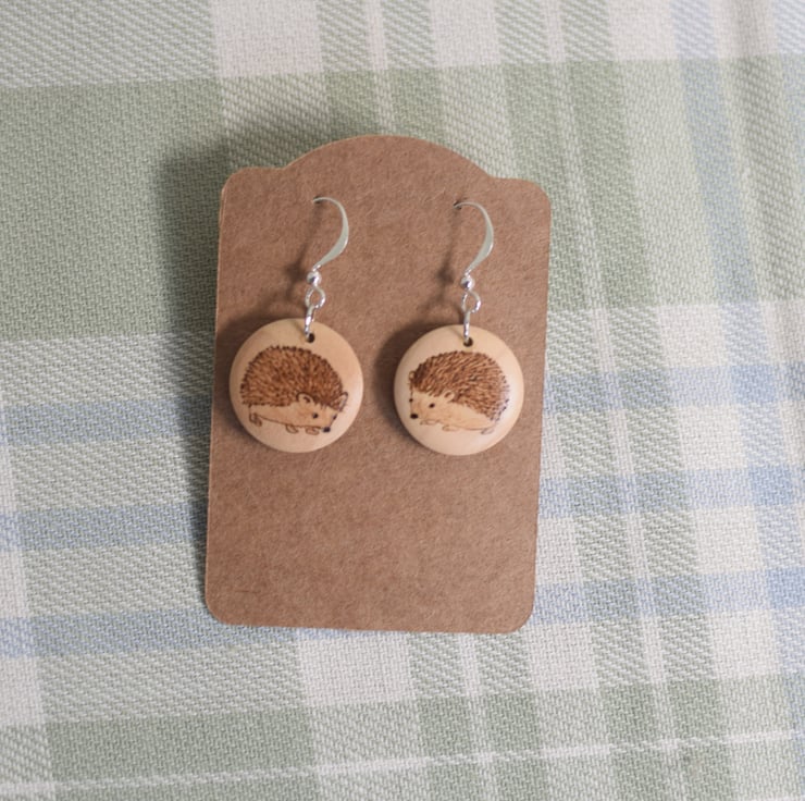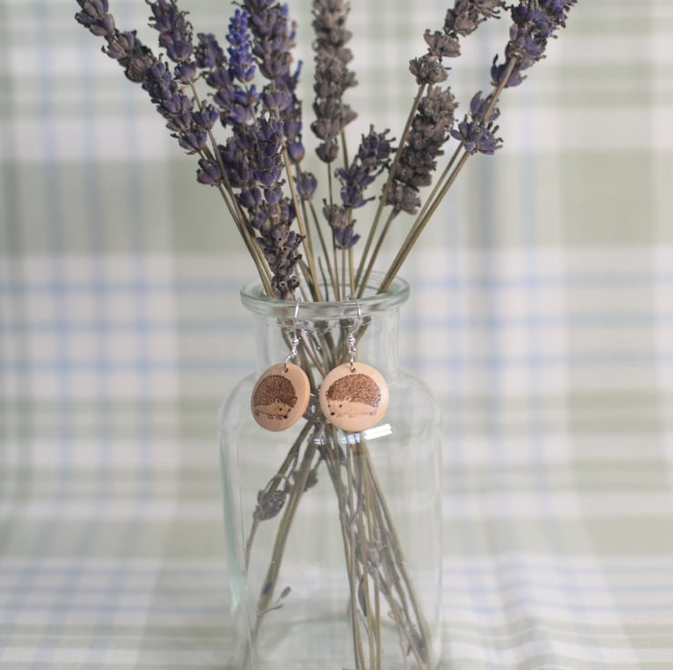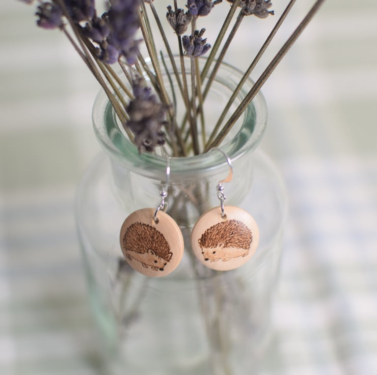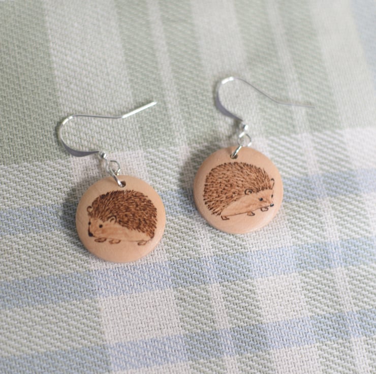 20mm wooden earrings on silver plated drop hooks with a hedgehog design on both sides and finished with a soft satin sheen varnish.