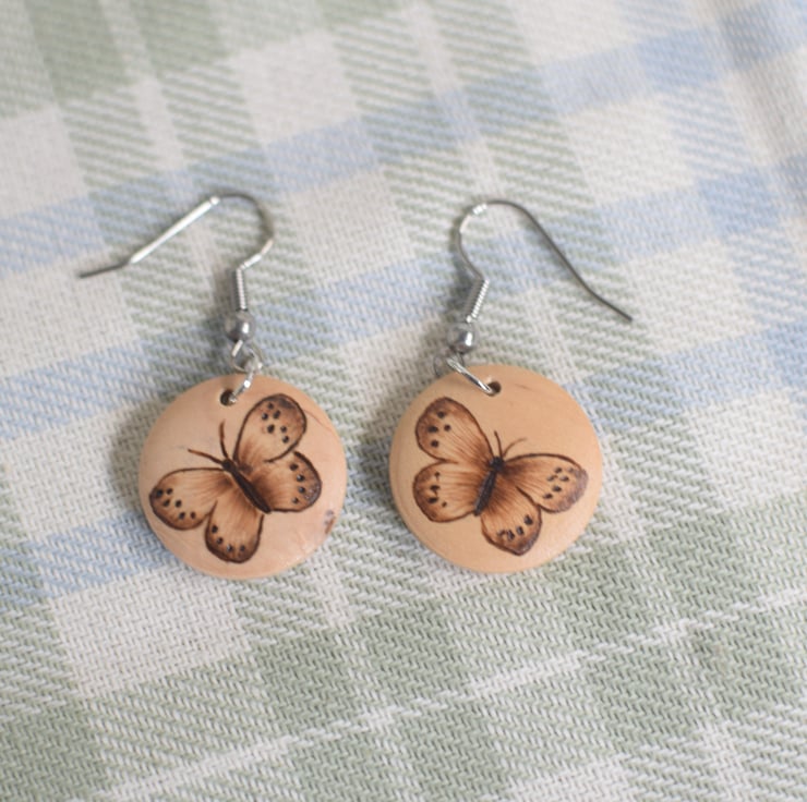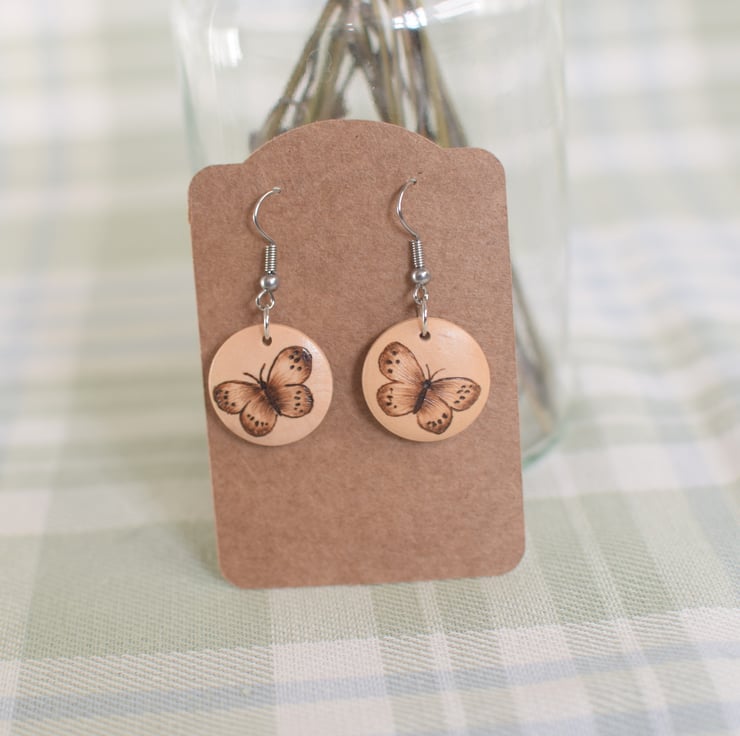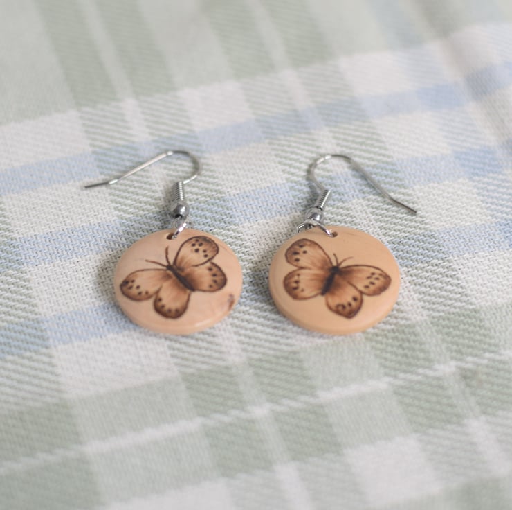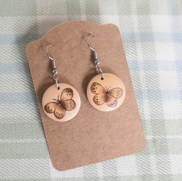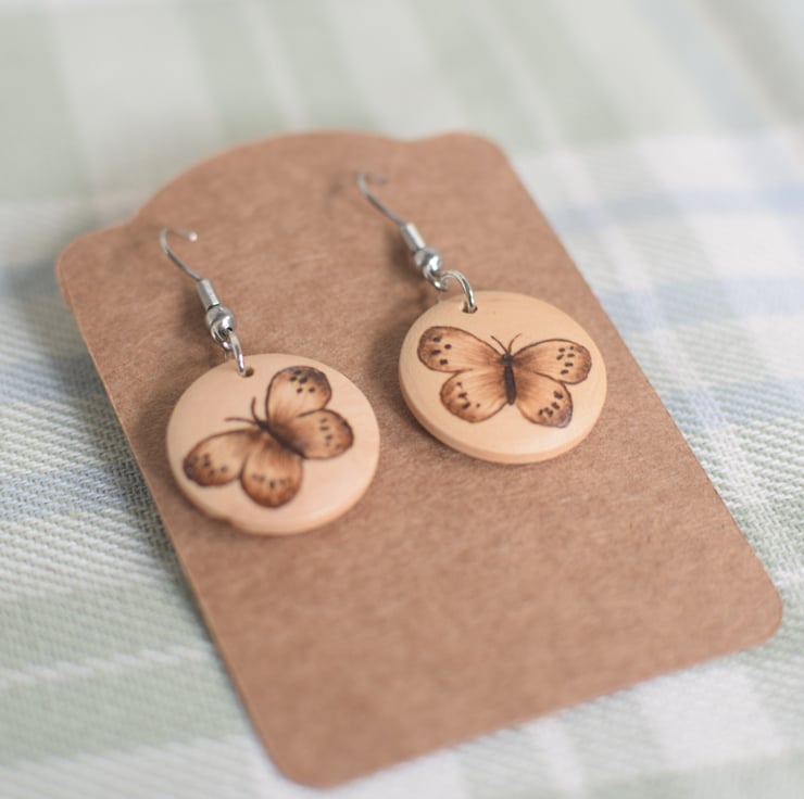 20mm wooden earrings on surgical stainless steel drop hooks with a butterfly design on both sides and finished with a soft satin sheen varnish.