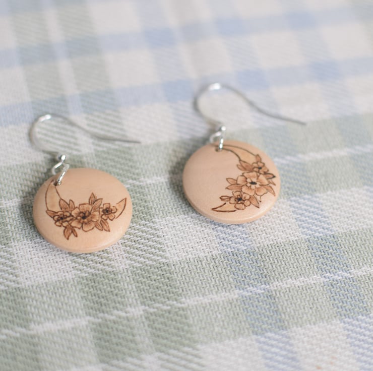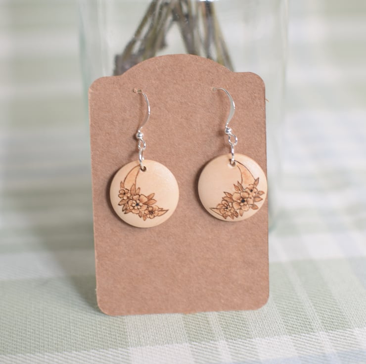 20mm wooden earrings on silver plated drop hooks with a floral moon design on both sides and finished with a soft satin sheen varnish.