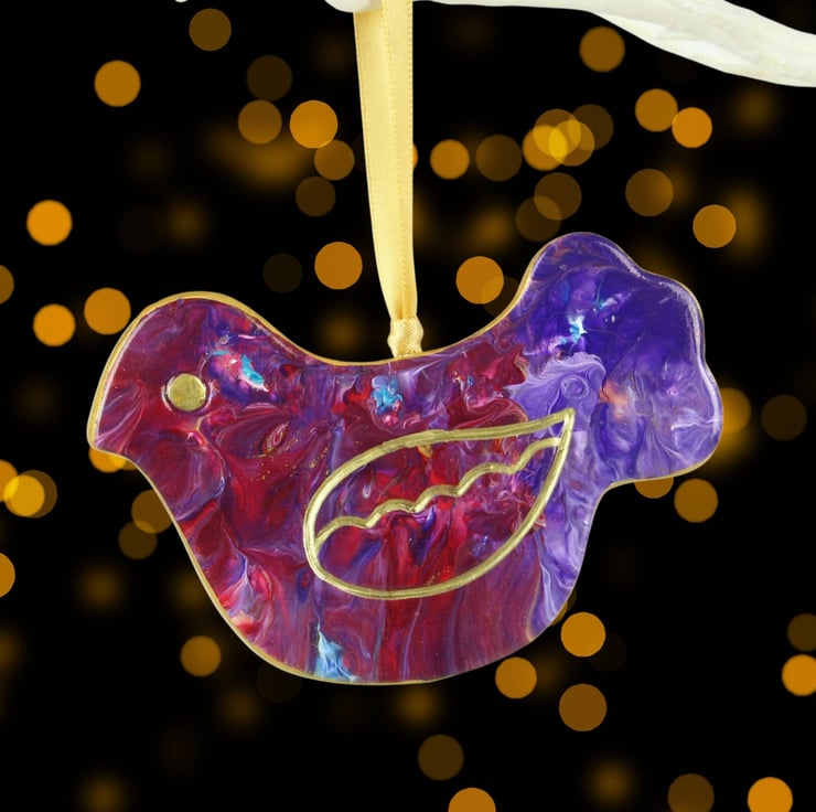 This lovely ceramic hanging bird decoration (possibly a dove, partridge or a calling bird!) has been decorated using the fluid pour dip technique in purple, gold and crimson with a few splashes of blue. The decoration is on the the front, the reverse is painted in plain gold.