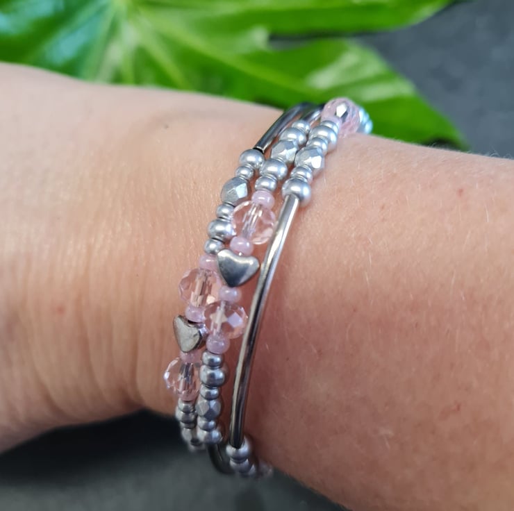 Unique and pretty in pink and silver bracelet that is threaded onto memory wire, which means its slips on the wrist easily with no clasp required. Its also one size fits most wrist sizes. A decorative crystal dangle at each end of the bracelet.