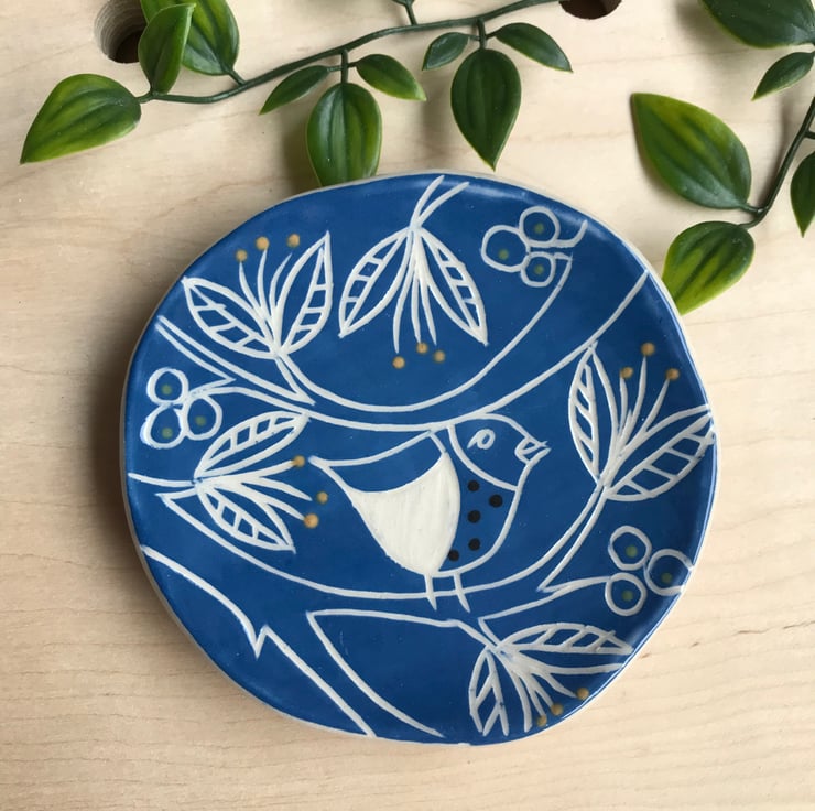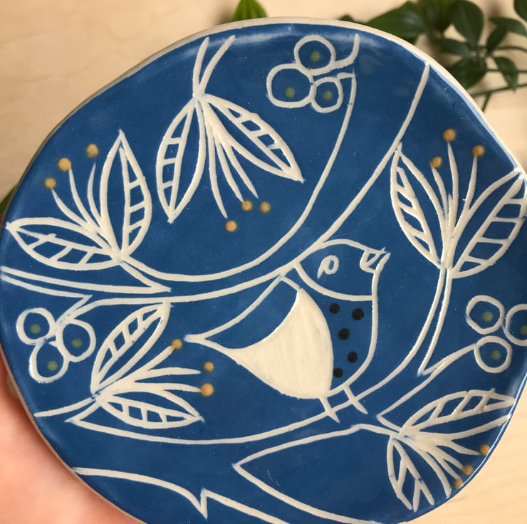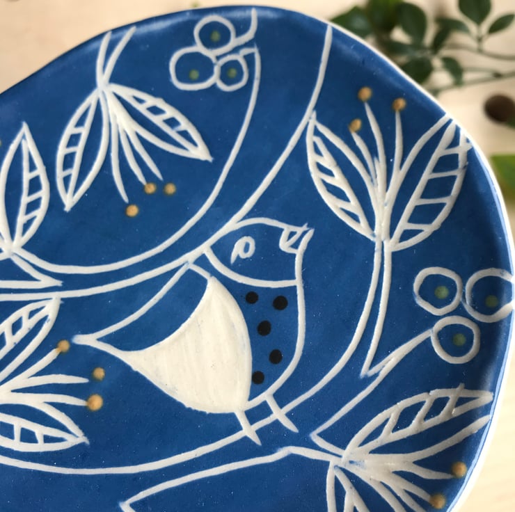 Handmade stoneware pottery plate glazed in rich navy blue with gorgeous little birds flitting from tree branches.