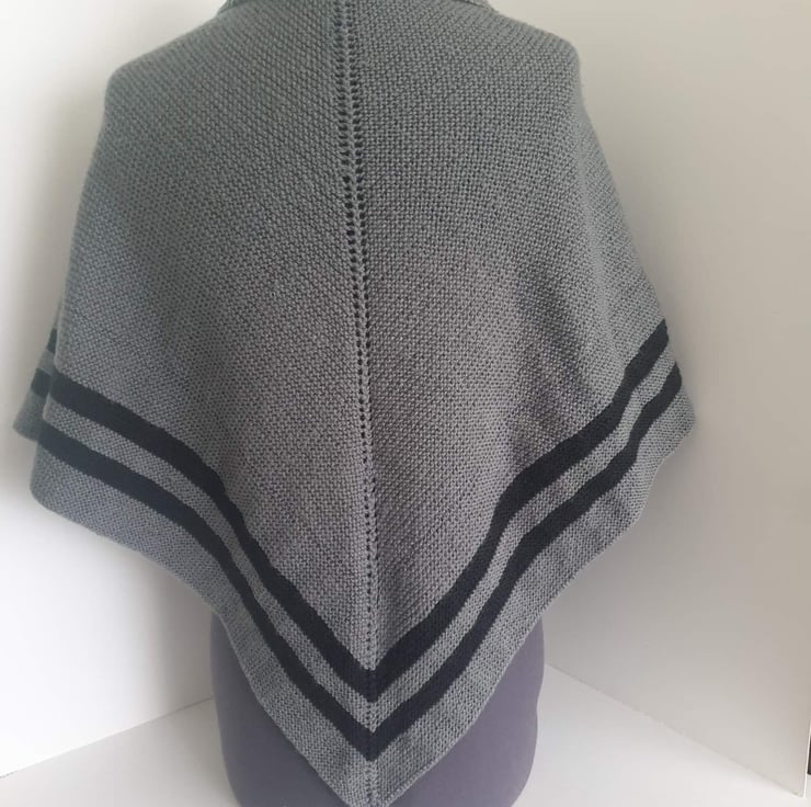 A beautiful hand knitted wrap around shawl in grey with black embellishments.