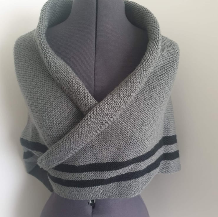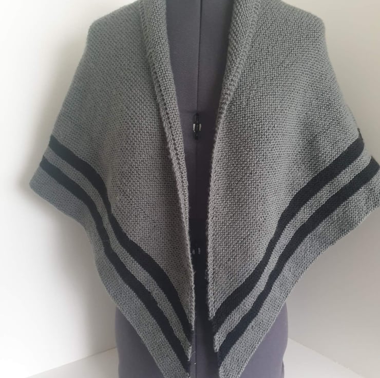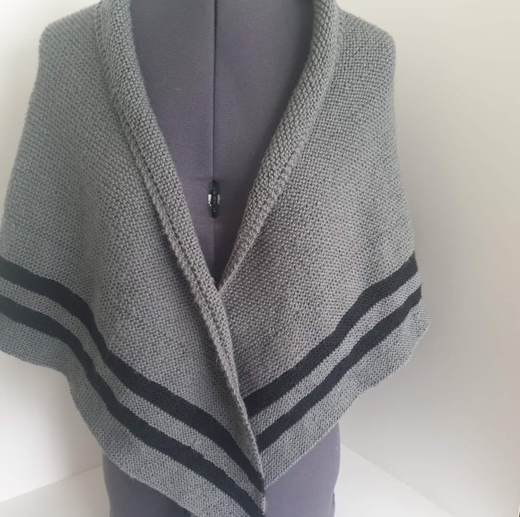 A beautiful hand knitted wrap around shawl in grey with black embellishments.
