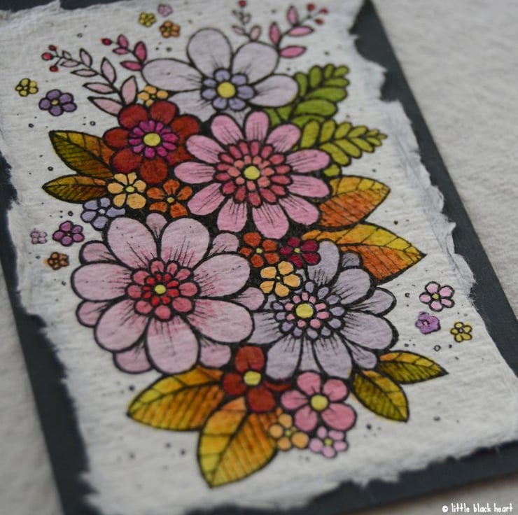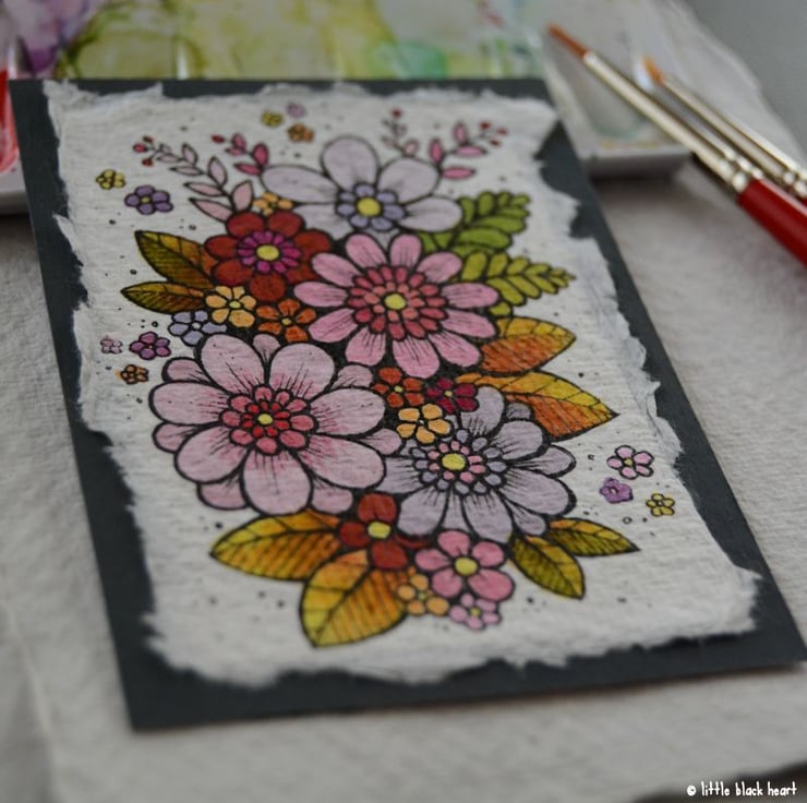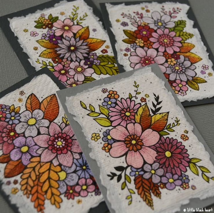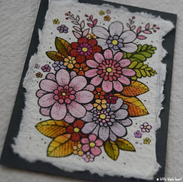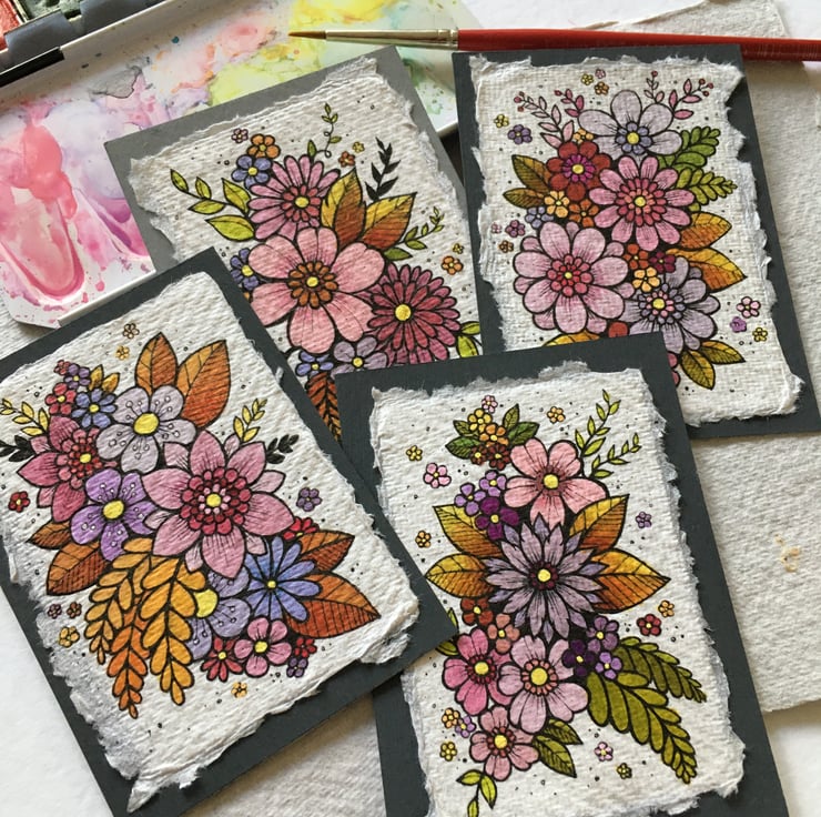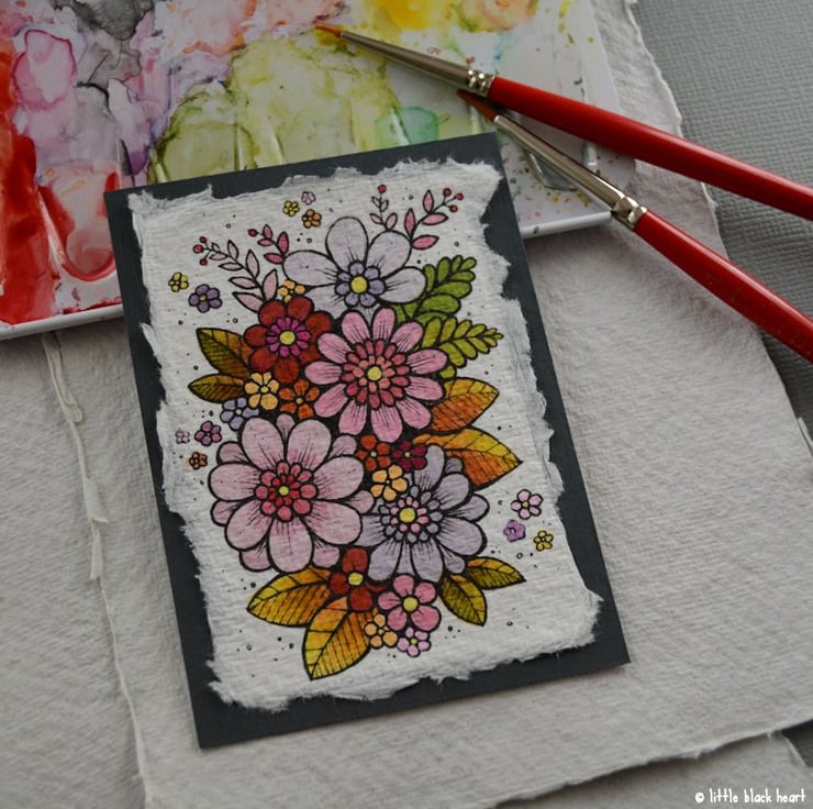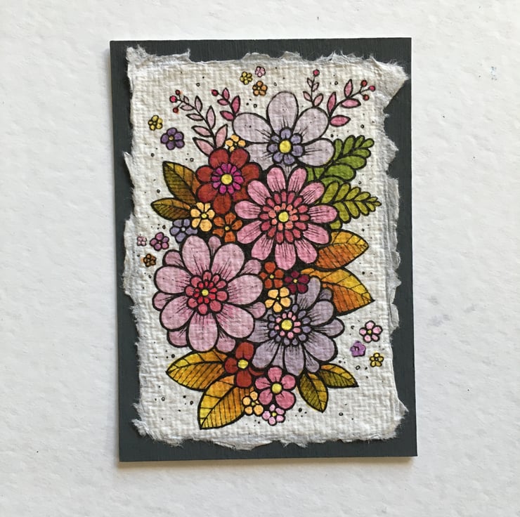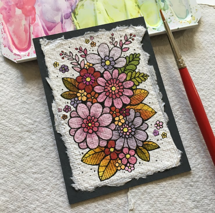 khadi paper is handmade in india from recycled cotton rag, it has a lovely textured surface and deckled edges. I have then mounted the illustration onto a hand painted aceo.