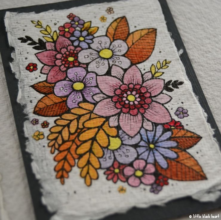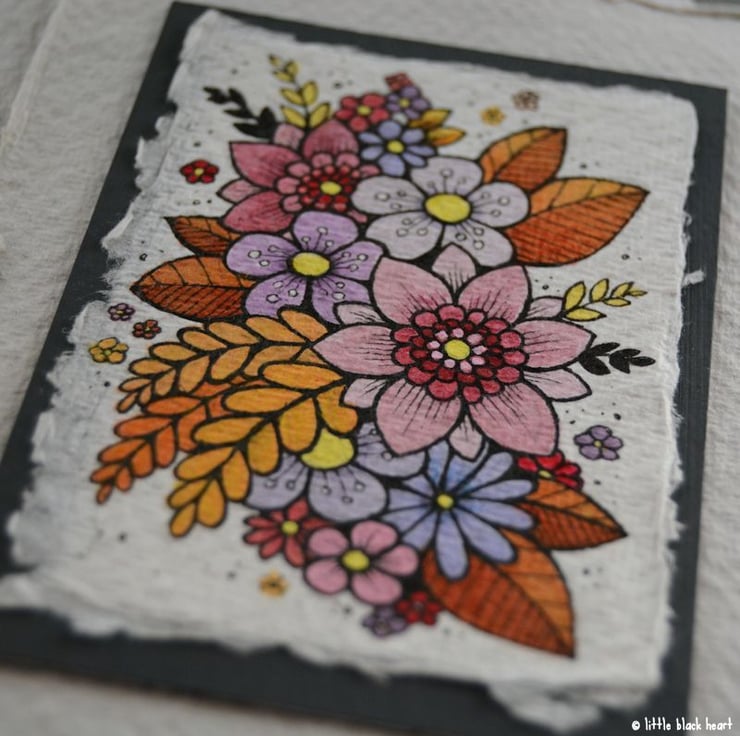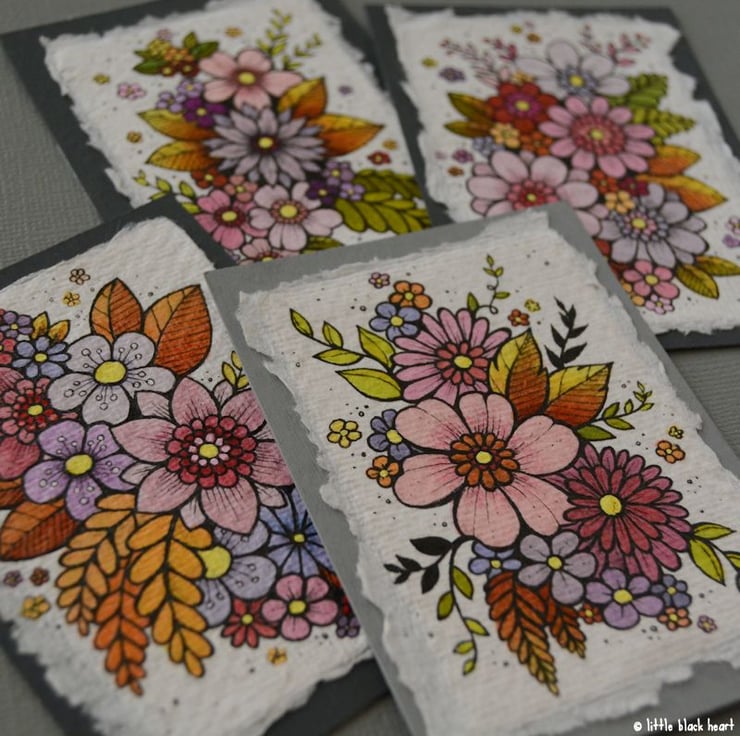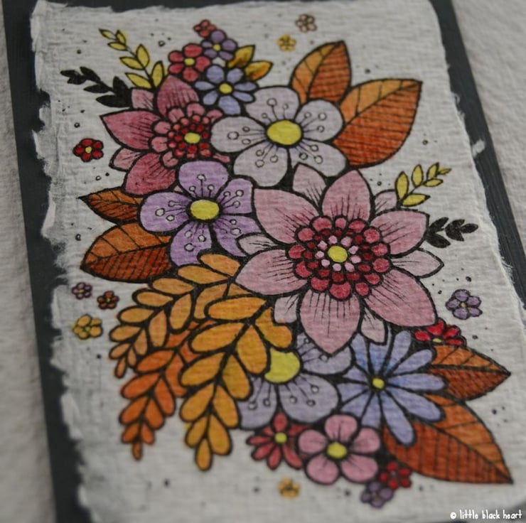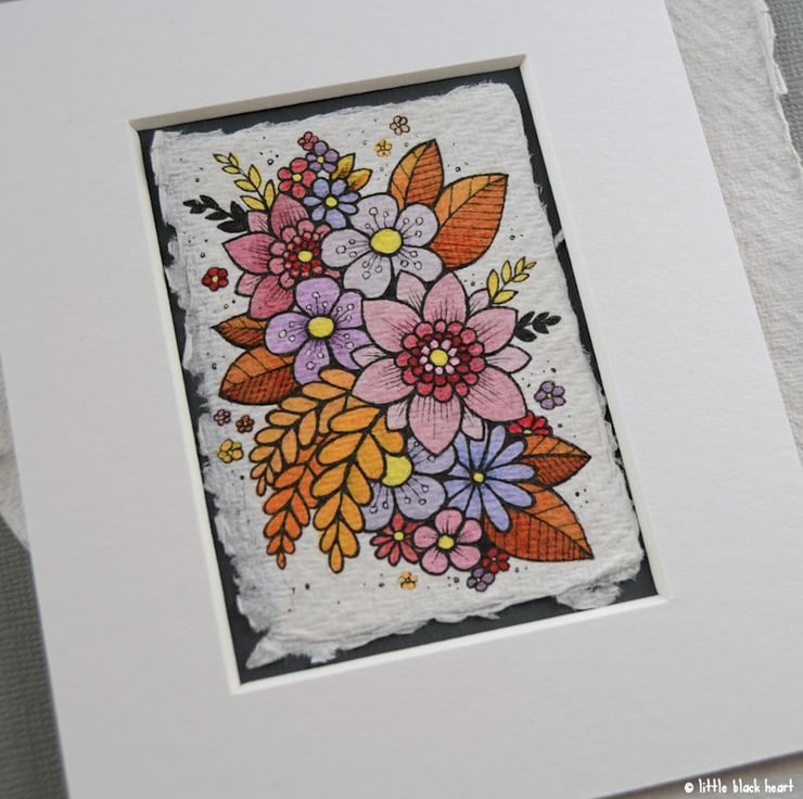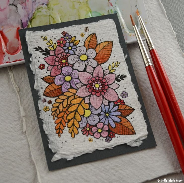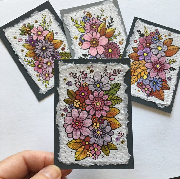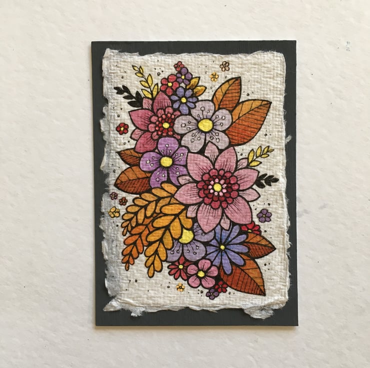 khadi paper is handmade in india from recycled cotton rag, it has a lovely textured surface and deckled edges. I have then mounted the illustration onto a hand painted aceo.