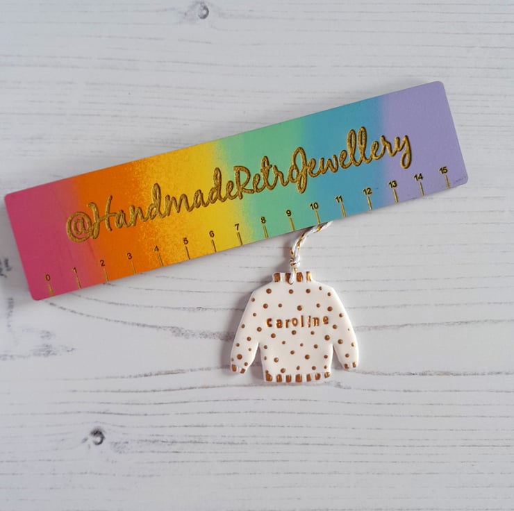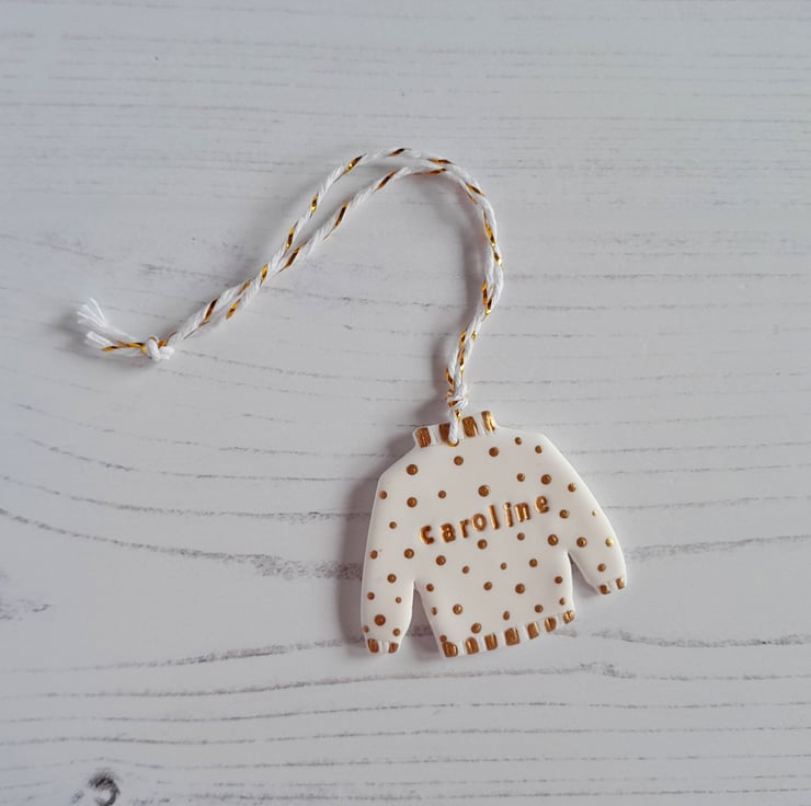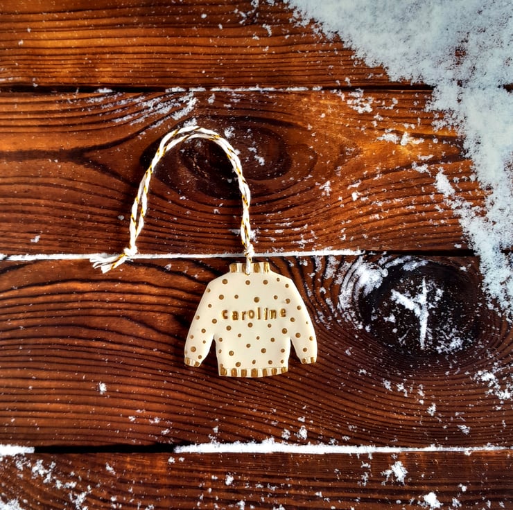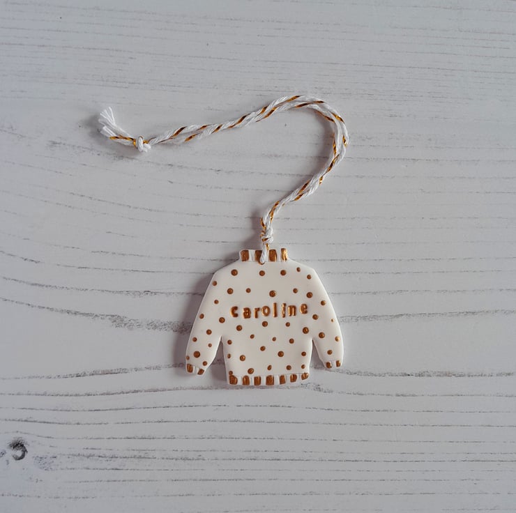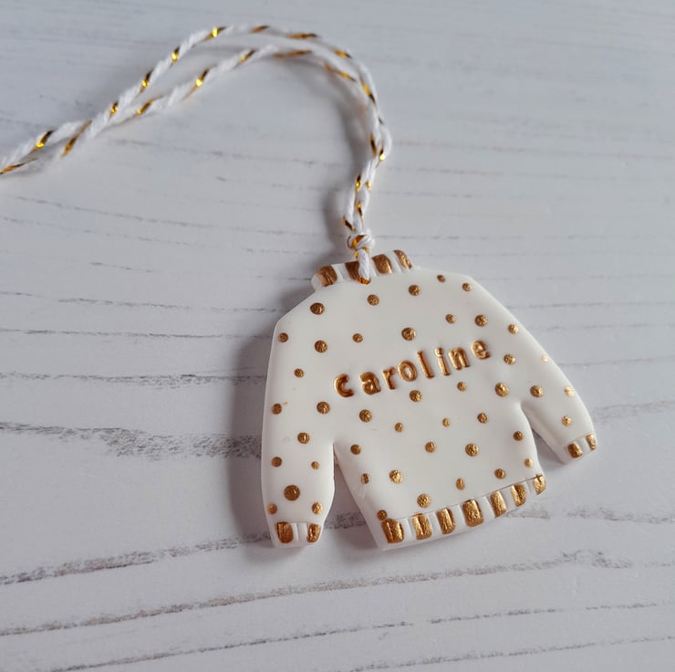 A fun Christmas jumper shaped decoration, hand made from white polymer clay, with gold dots hand painted using acrylic paint. A name of your choice is hand stamped along the middle and filled in using gold acrylic paint. Finished with a hole and twine string attached, ready to hang in your home.