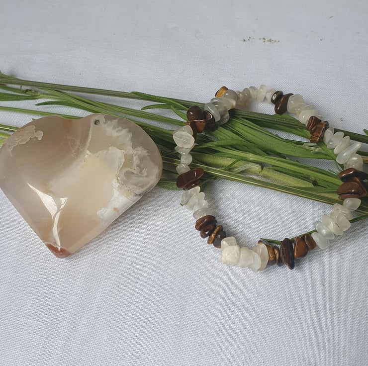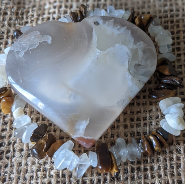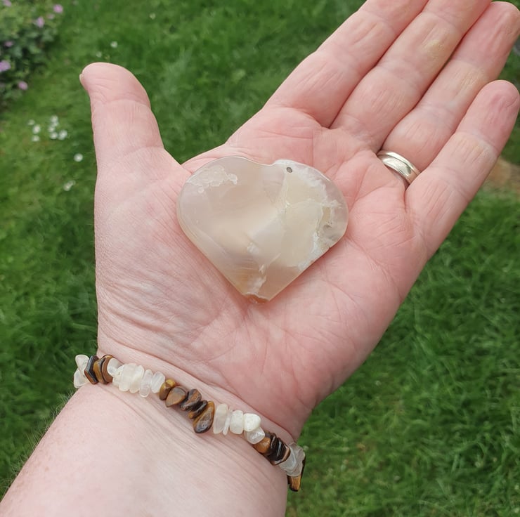 This beautiful large flower agate heart comes with a moonstone and tiger eye bracelet, to see you through difficult times.