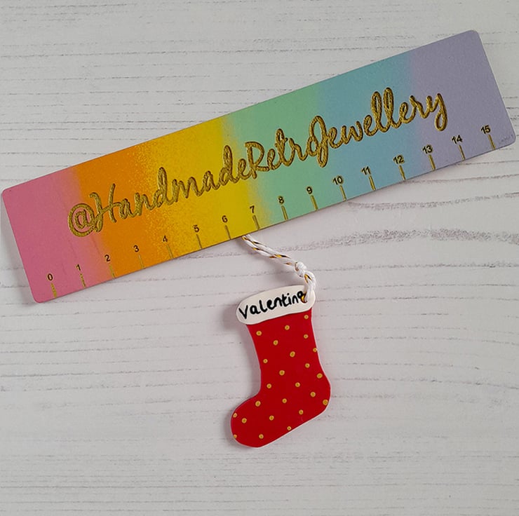 A cute stocking shaped decoration, hand made from polymer clay, with dots hand painted using gold acrylic paint. A name of your choice is hand painted along the top. Finished with a hole and twine string attached, ready to hang in your home.