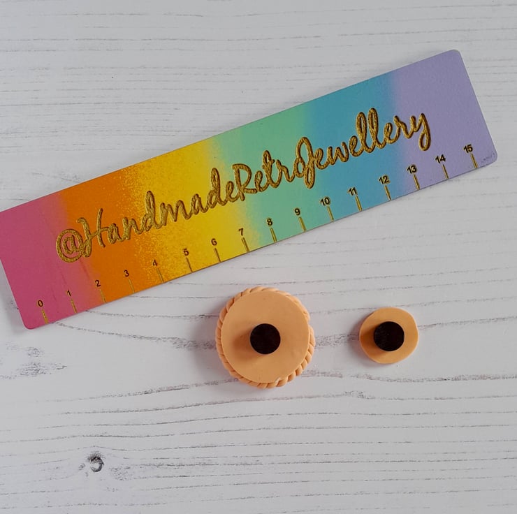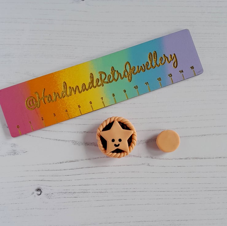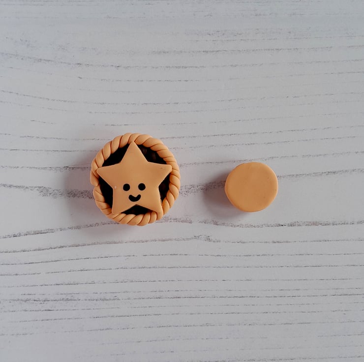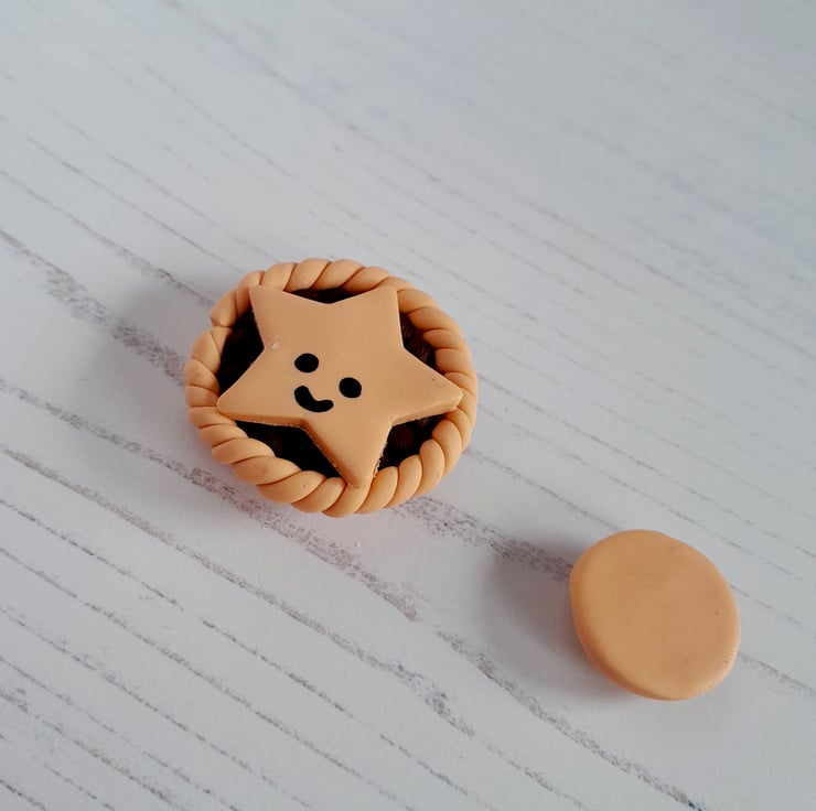 This festive needle minder is hand made by myself using polymer clay, in the shape of a cute mince pie, with a smiley face hand painted for extra detail!