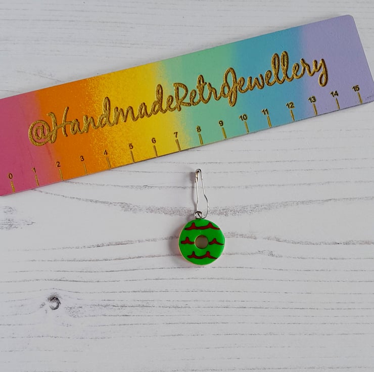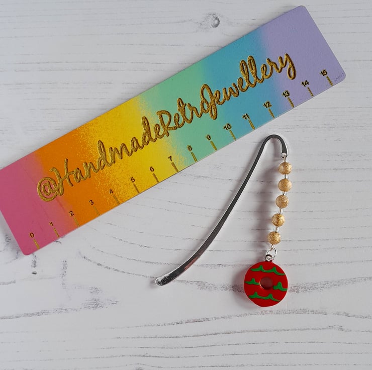 The mini Party Ring charms are hand made using polymer clay, with detail hand painted using acrylic paint, They are then fixed onto an eye screw, with a jump hoop attached. The charm is then fixed onto your choice of fixing to create a bookmark (with gold beads), a stitch marker hook or a silver plated necklace (18 inches chain approx)