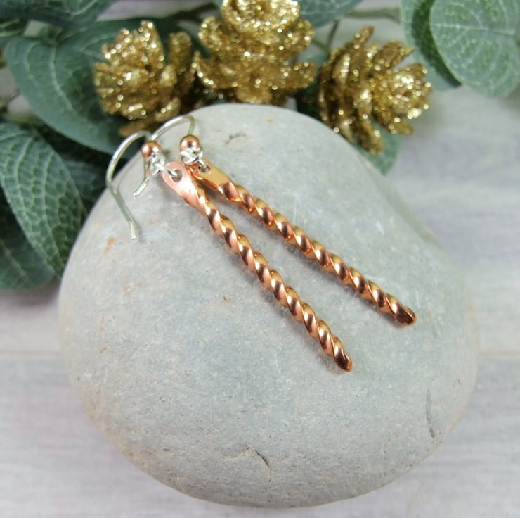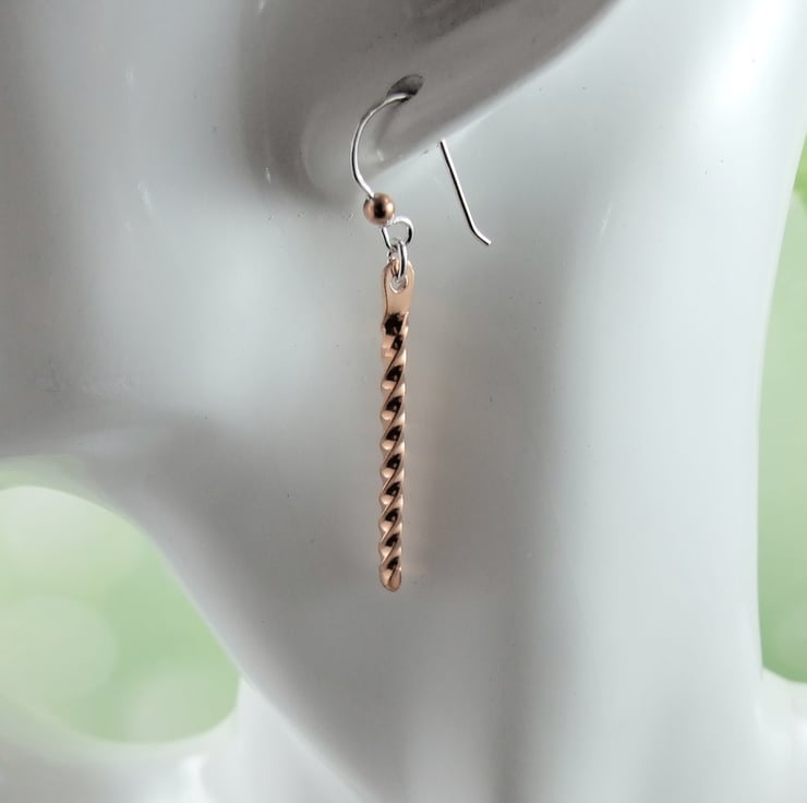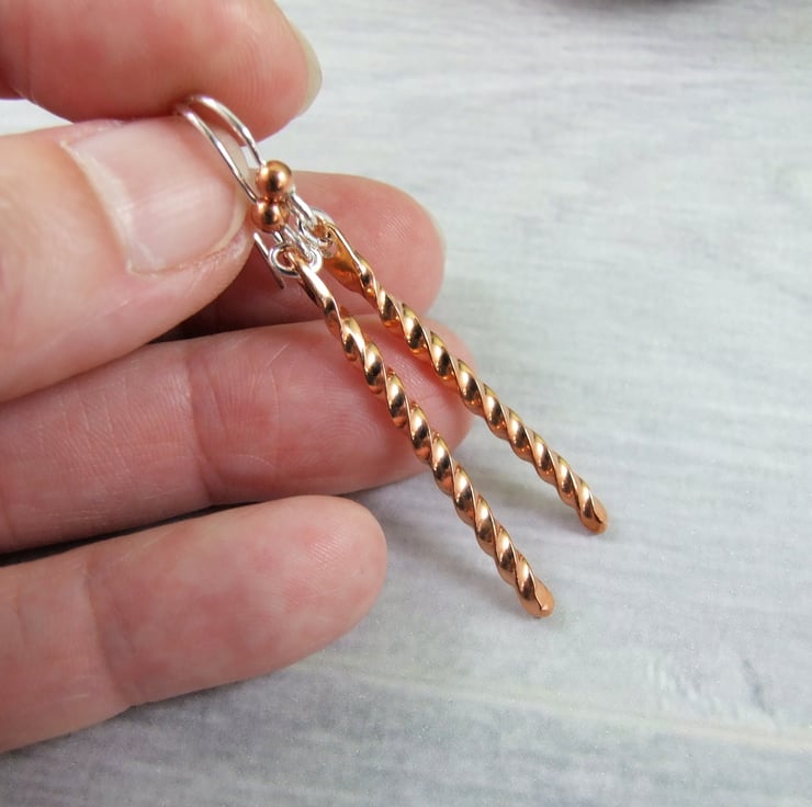 The droppers have been created with copper wire wire that I have flattened slightly and then twisted to create pretty reflective bars. Fitted to .925 sterling silver ear hooks with copper beads..