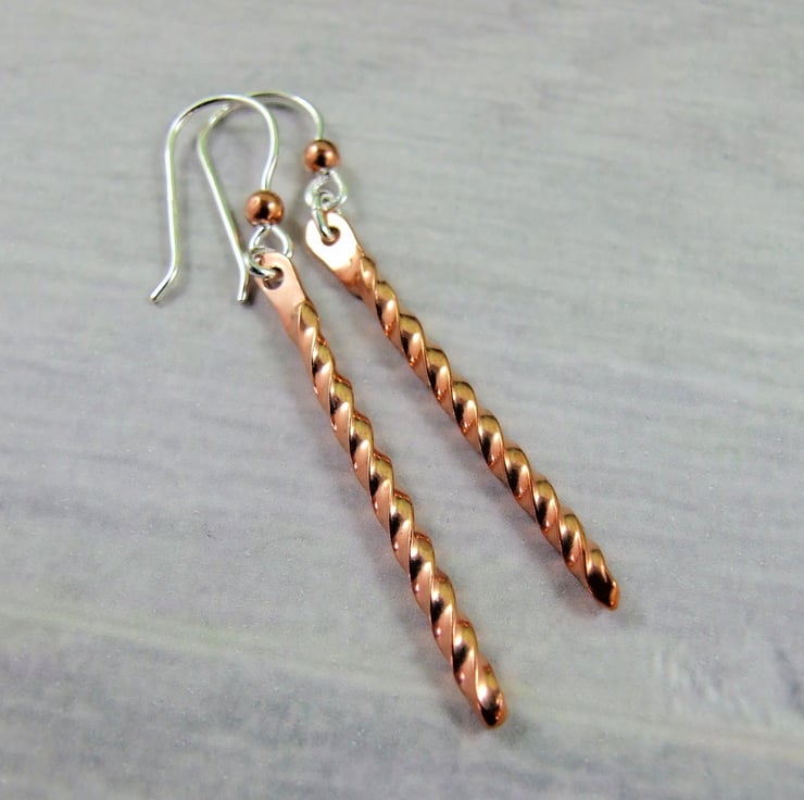Sterling Silver & Copper Earrings. Long elegant spiral twist droppers