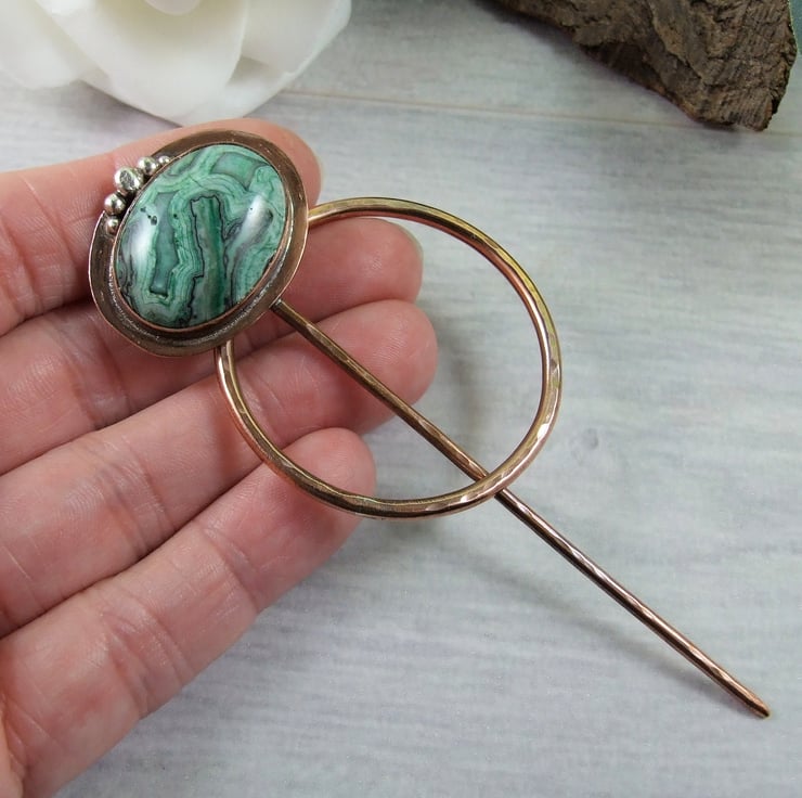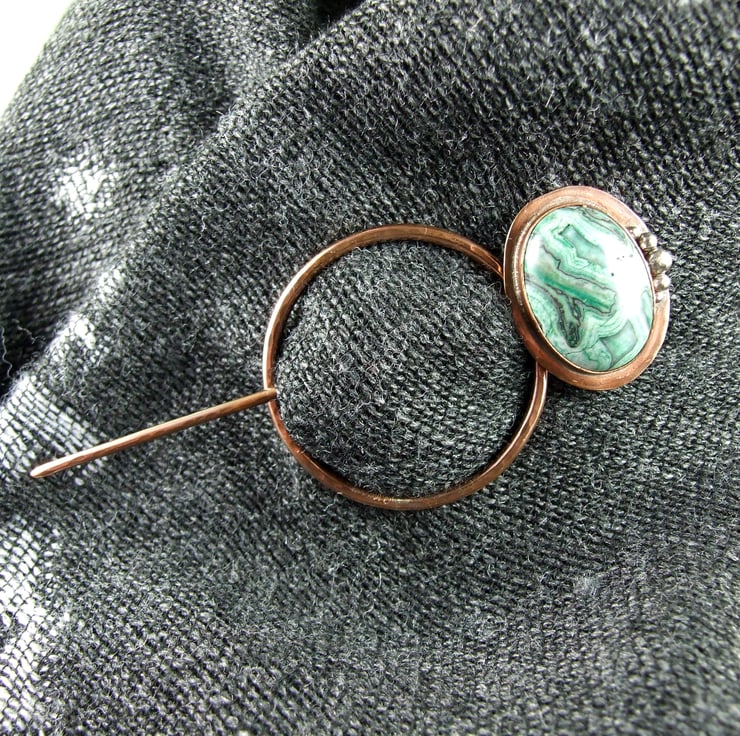 Hand forged copper shawl pin for Open Weave or Knit Shawl, Scarf, Wrap or Cardigan. The pin holds a Dyed Green Jasper cabachon.