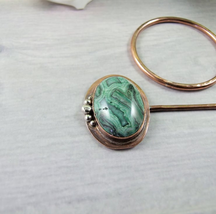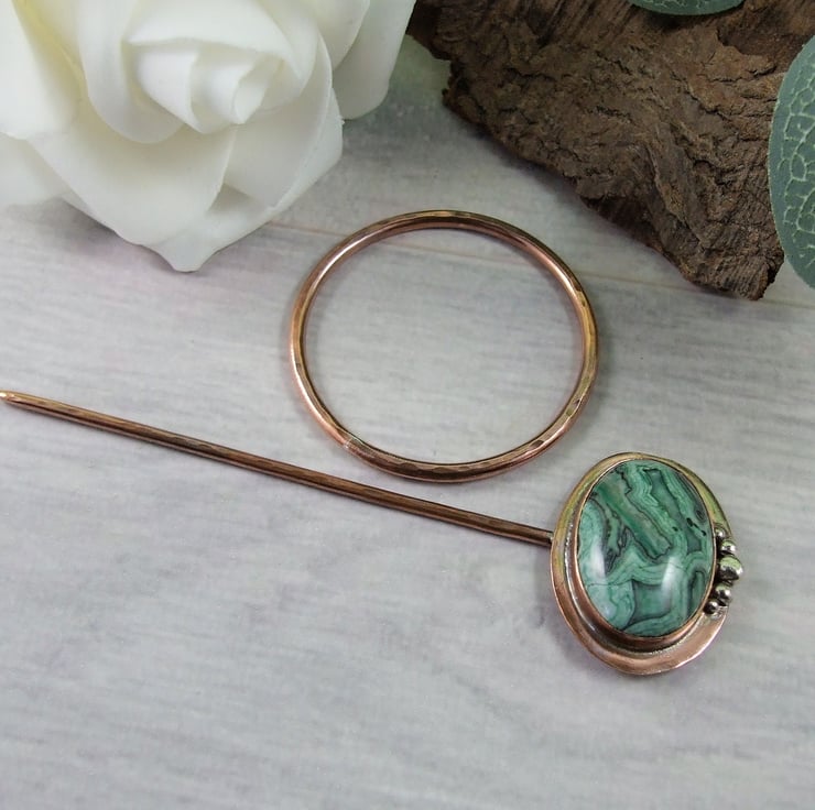 The ring is hand forged from 2.5mm solid copper wire with hammered texture. The the pin is made from 2.5mm wire, shaped with a rounded blunt point and a paddle formed at the other with a bezel made from copper and has been made to fit the jasper cabachon perfectly.