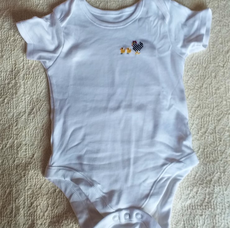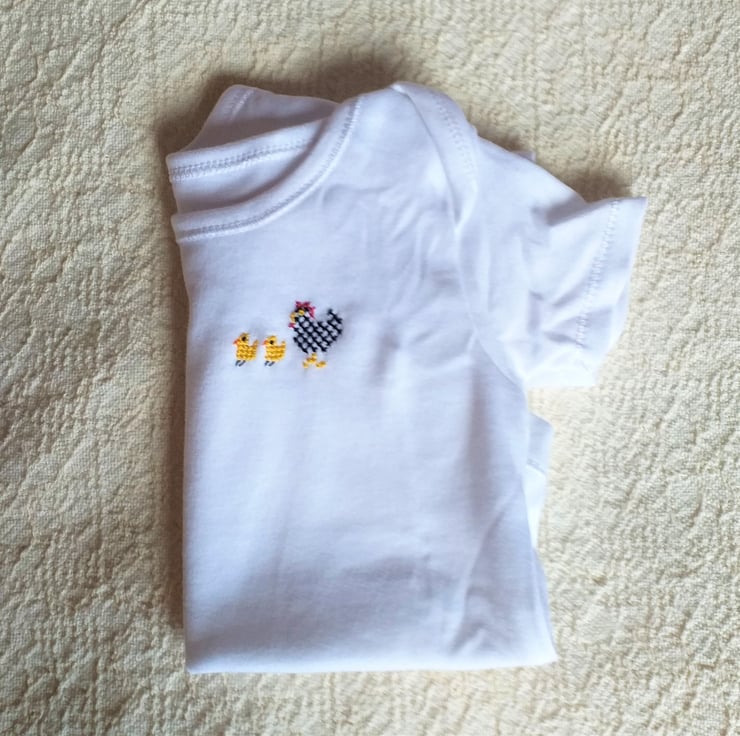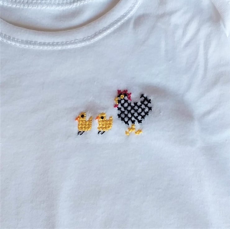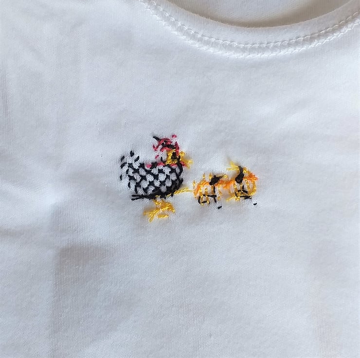 What a lovely gift for a baby! I have cross stitched a black and white speckled hen and her two yellow chicks on the left front of a white baby vest/onesie. As I never use a permanent backing material when hand embroidering kids' clothing, there is nothing inside this garment to irritate your baby's skin. The vest has an envelope neck, short sleeves and three press studs between the leg openings. It is 100% cotton and can be machine washed.