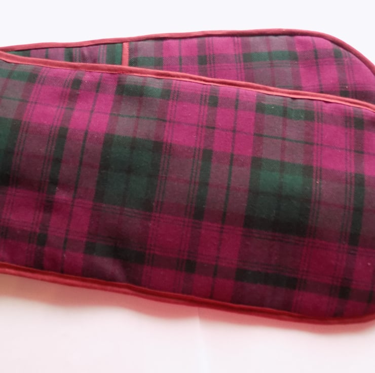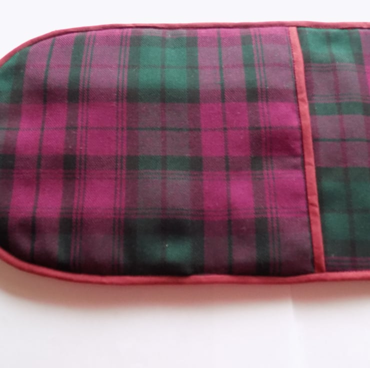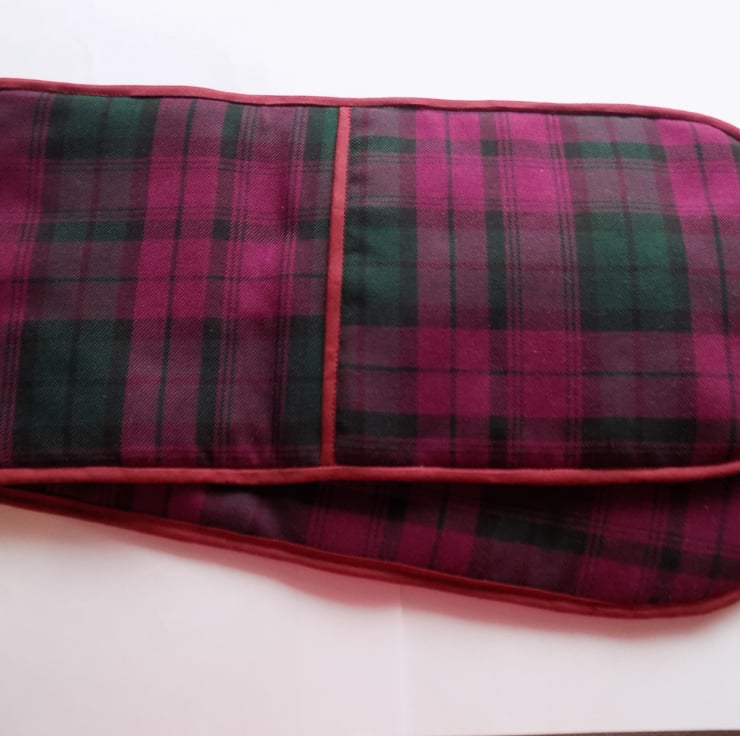These high quality handmade double oven gloves are made from a beautifully soft polyviscose fabric, and feature a wine, dark pink and dark green plaid pattern.