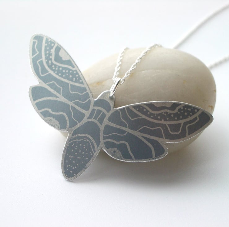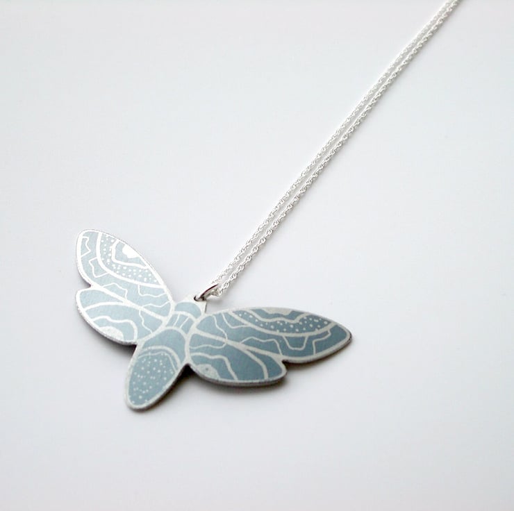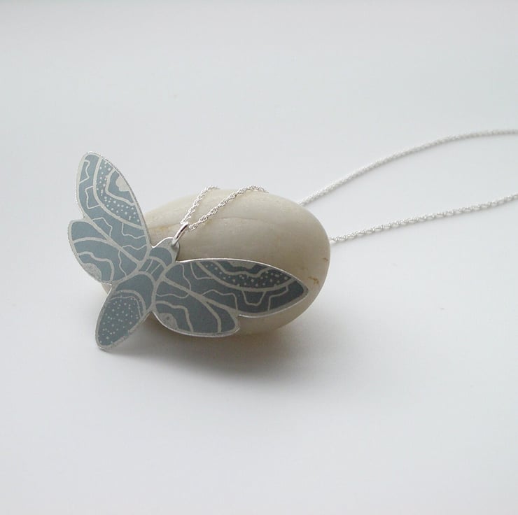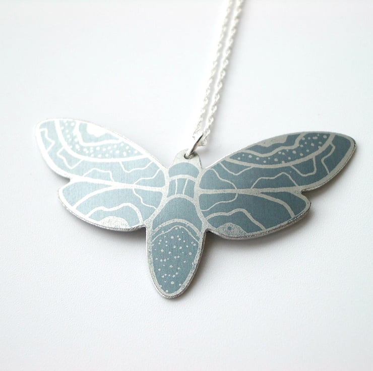 This moth pendant is made from aluminium which I have hand dyed and printed to create this pretty piece of lightweight jewellery. I have dyed the aluminium a light grey and printed with a silver print. I cut the moth shape using a traditional jeweller’s saw and file the edges to give a nice smooth finish.