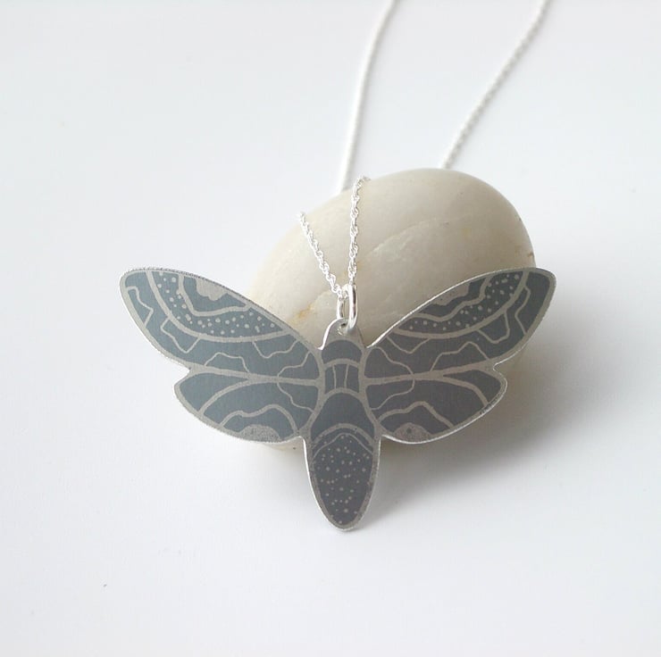 The moth measures approximately 54mm in width and 32mm in height and hangs from an 18” sterling silver chain.
