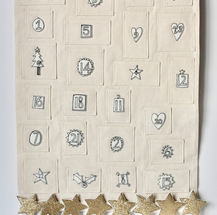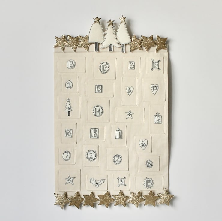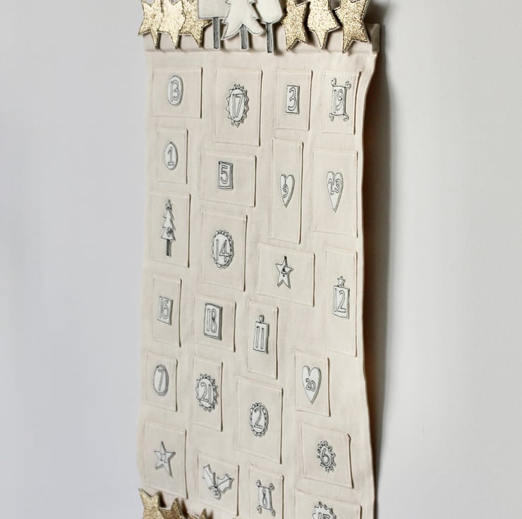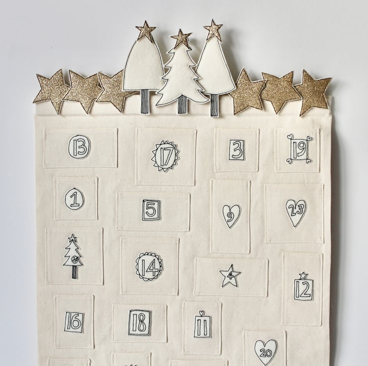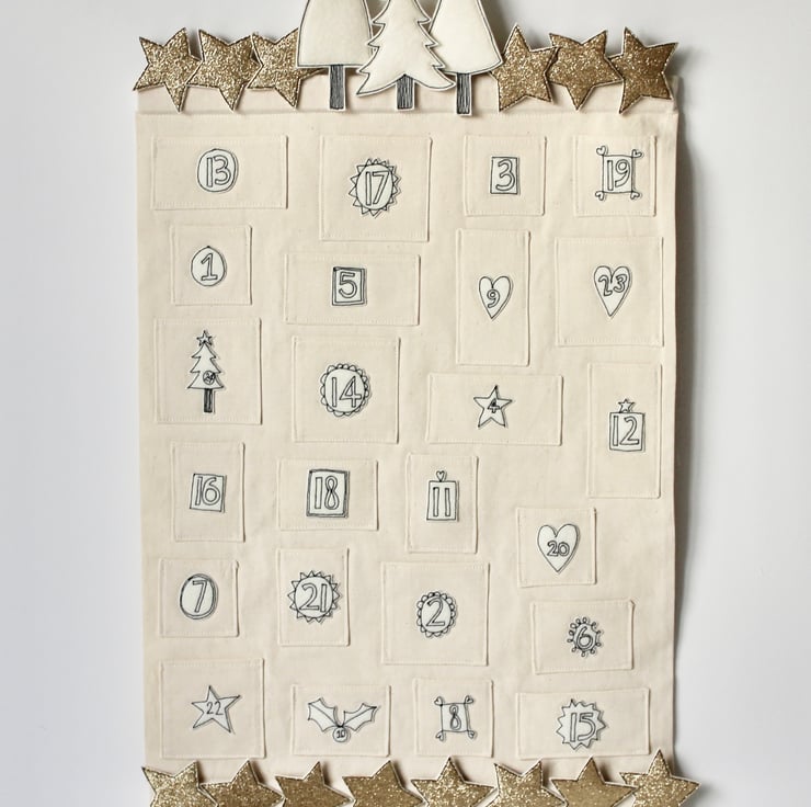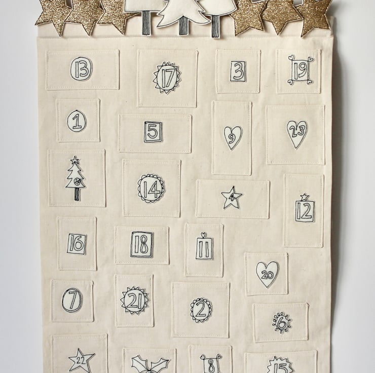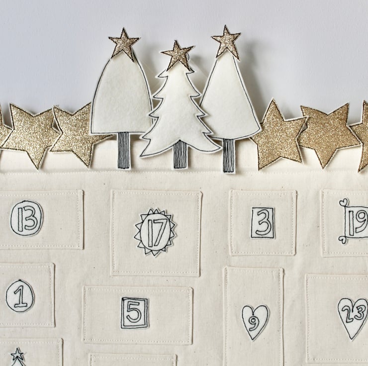 Each calendar has twenty four pockets, each embroidered with a number and along the calendar top are three sewn Christmas trees and six stars and along the calendar bottom are eight stars.