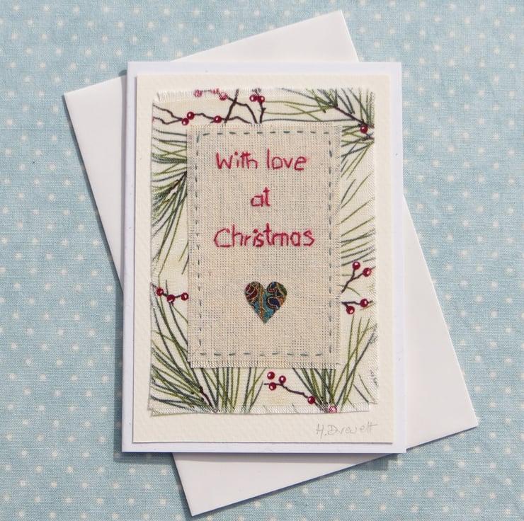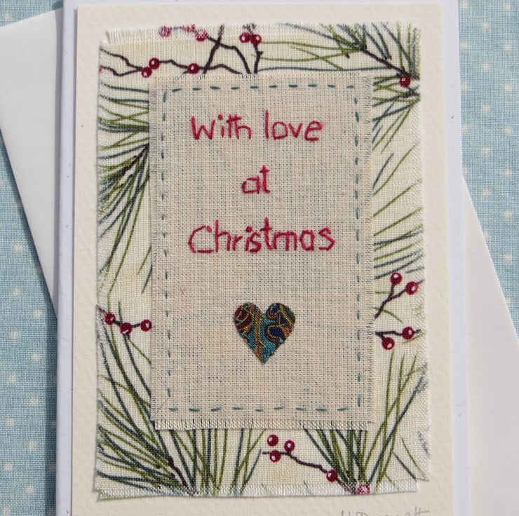This is a hand-stitched miniature textile mounted onto greeting card. I have hand-stitched the words onto plain cotton adding a tiny applique heart. The central panel is stitched to a pretty pine tree fabric.