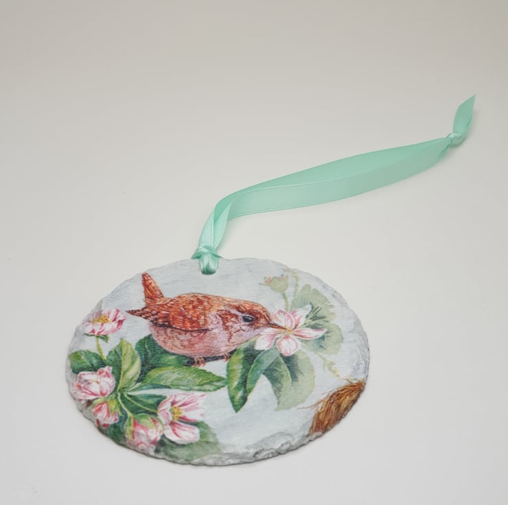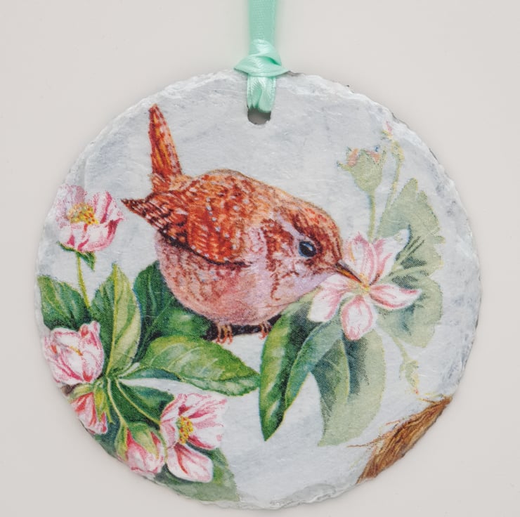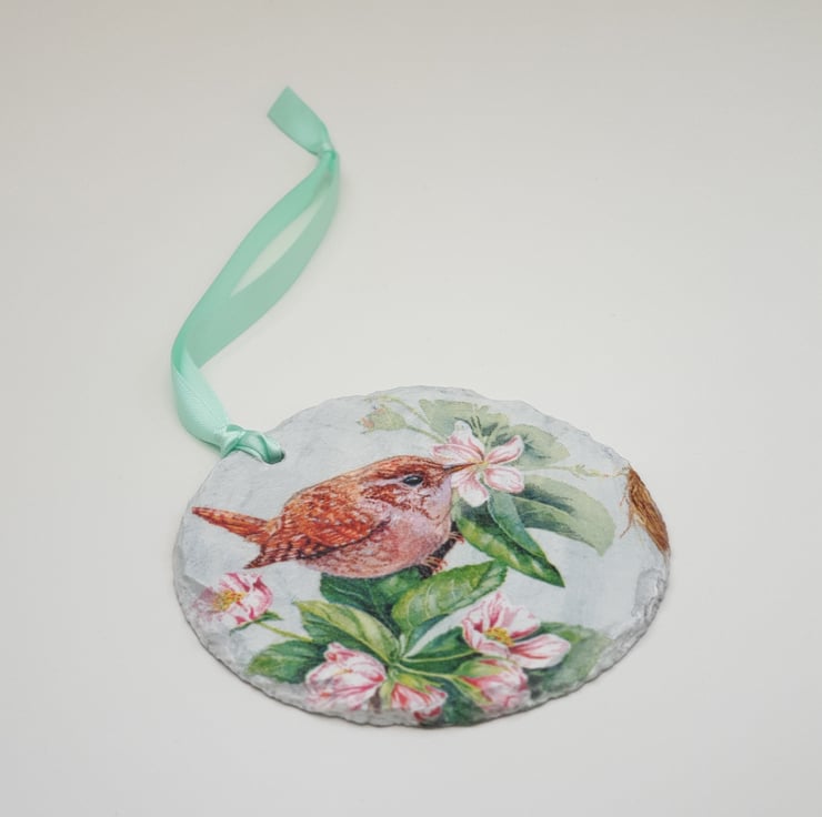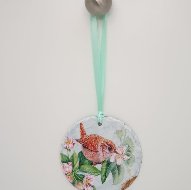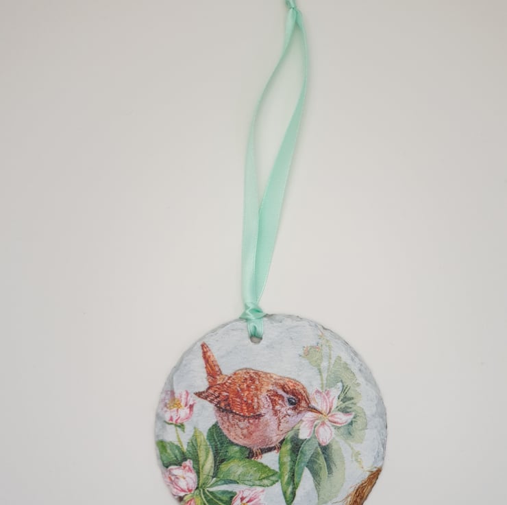 Sweet little Jenny wren slate hanging decoration. The wren has been lovingly decoupaged onto a round piece of slate and is ready to hang with pale green satin ribbon. The rear of the decoration has been left as plain slate. The whole slate has been finished with satin varnish for protection. This pretty wren would make a lovely addition to your home decor and would look perfect hanging in a window, from a handle or mantlepiece,