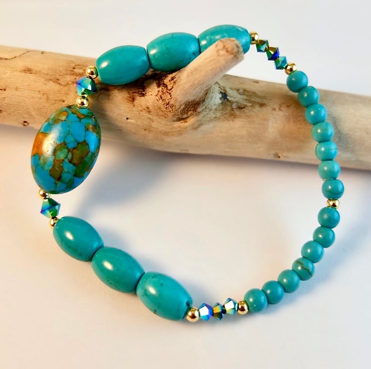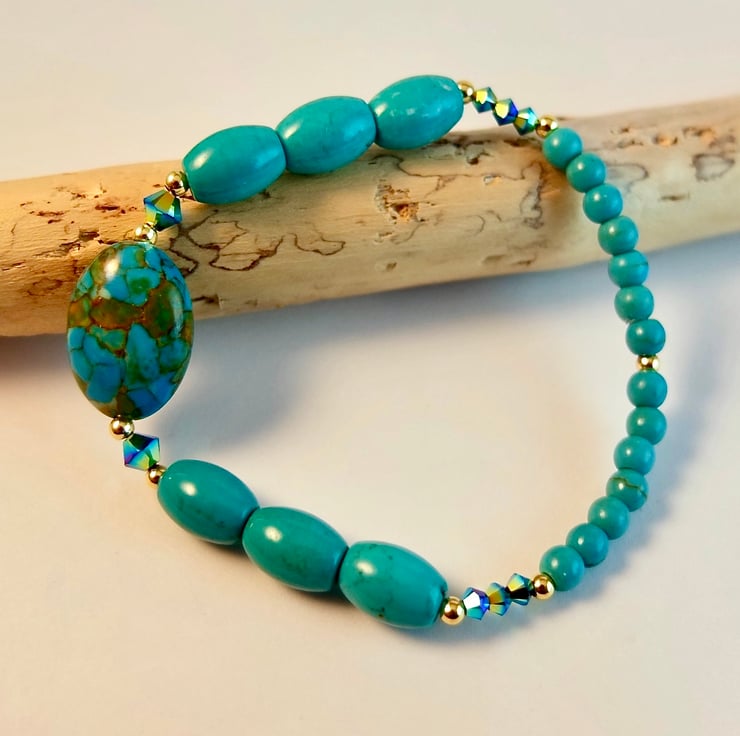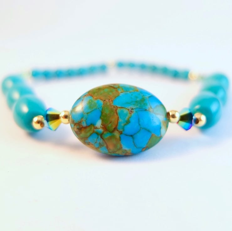 Stunning turquoise bracelet featuring a 12x18mm oval 'Mosaic Turquoise' (dyed Magnesite) focal bead, flanked by brilliantly sparkly, 4mm Swarovski Jet AB2 bicones and 2.5mm gold vermeil beads.
