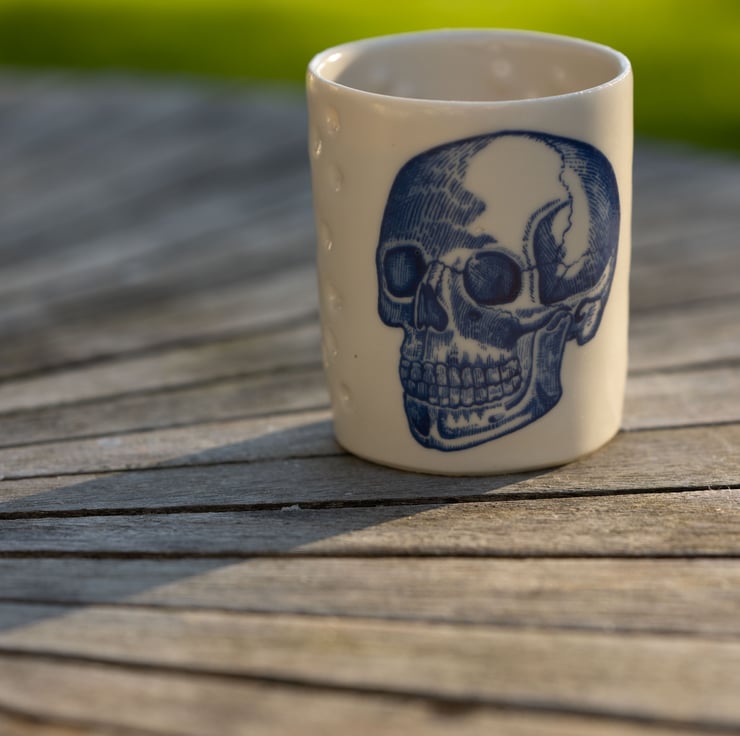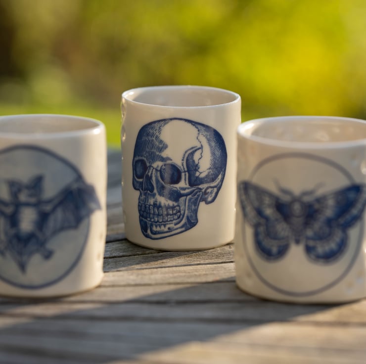 This votive was made to test how well a shiny glaze would take an image firing and is being sold as a second in the Super Seconds Festival at 50% OFF the retail price. There is a tiny mark that you can feel on the front just above the right eye socket (it is very small) and the porcelain warper a little in the hot firing, so the finish didn't quite make it through my quality check 100%, however it is still functional and very beautiful.