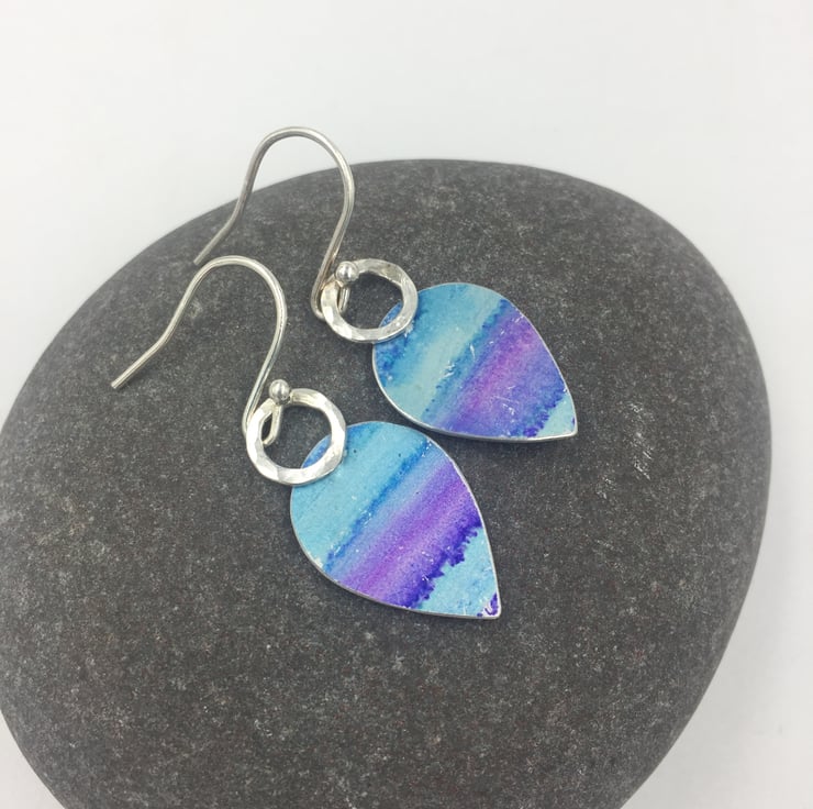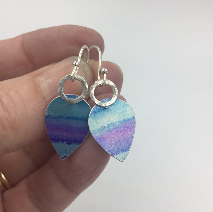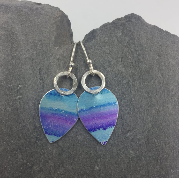 These anodised aluminium earrings have been hand painted with alcohol ink in shades of turquoise and purple. The metal has been steamed to seal in the colours. The drop is riveted to a hammered silver ring and hang from handmade sterling silver ear hooks.