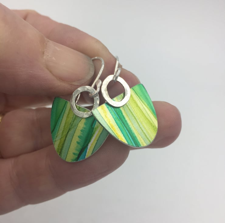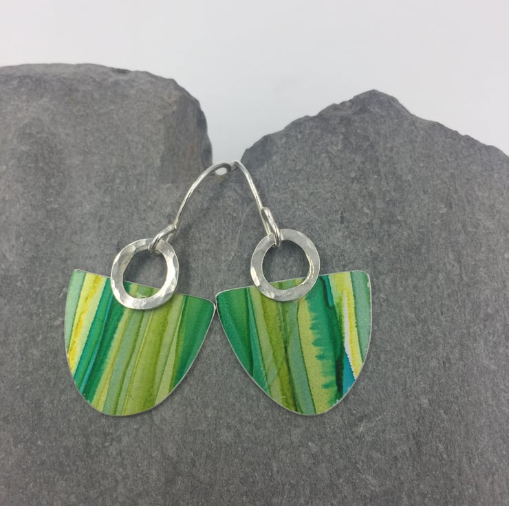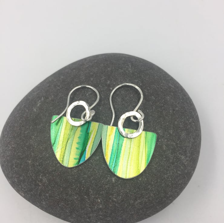 These anodised aluminium earrings have been hand painted with alcohol ink in shades of green. The metal has been steamed to seal in the colours. The semi oval shape is riveted to a hammered silver ring and hangs from handmade sterling silver ear hooks.